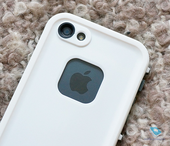 На задней панели есть вырез, видно яблоко, объектив и вспышка закрыты. На левом торце - дополнительные выступы для защиты от ударов. Как видно, экран утоплен, чтобы при падении выступающие части приняли удар. В целом, все очень похоже на многие защищенные телефоны - это касается и заглушек, и резиновой полоски на задней части корпуса, и конструкции основной части, этакий бутерброд на торцах.
