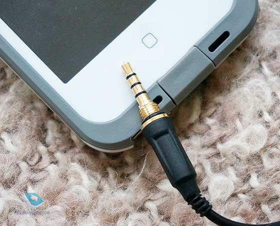 На нижней части есть паз для крепления ремешка, дополнительные прорези для того, чтобы чехол не глушил звук. Заглушка разъема 3,5 мм ввинчивается в корпус, Lightning закрывает обычный клапан. Все кнопки дублируются, причем сделано толково, рычажок отключения звука работает четко.
