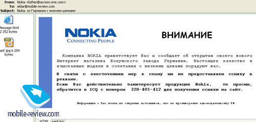 Уже последующие письма не содержали прямой ссылки на сайт, но предлагали обратиться за адресом в ICQ. Вы представляете себе крупного производителя, который шифруется подобными методами? Лично для меня это первый показатель того, что кто-то пытается смошенничать. Раскроем завесу тайны и приведем адрес сайта, благо он был доступен в письмах – http://www.nokiarus.ru