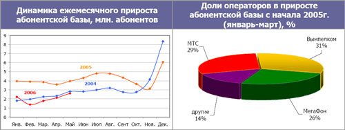 Совокупный прирост количества абонентов в мае составил 2,5 млн. (+2,0%) – это максимальный рост с начала года. Примерно такой же была прибавка в мае 2004 г., тогда как в мае 2005 г. рост составил 3,9 млн. абонентов. Годовые темпы прироста абонентской базы неуклонно сокращаются (со 105% в январе 2005 г. до 44% в мае 2006 г.).