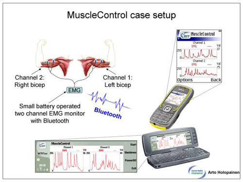 Nokia 6085 предназначен для сетей GSM (850/900/1800/1900 МГц), поддерживает стандарт передачи данных EDGE. Он оснащается 1,8-дюймовым внутренним дисплеем с разрешением 128х160 пикселей и поддержкой 262К цветов, внешний дисплей позволяет отслеживать информацию о входящих звонках, времени, уровне сигнала и заряда аккумулятора. Не обошлось и без встроенной камеры с поддержкой видеозаписи, ставшей практически обязательным атрибутом для современного телефона. Однако у неё совершенно не впечатляющее разрешение - только VGA. Так же имеется музыкальный плеер, FM-тюнер и поддержка интерфейса Bluetooth, позволяющего передавать стереозвук. Можно использовать карты памяти формата microSD. Время работы в режиме разговора достигает 5 часов (надо отметить хороший результат), а время работы в режиме ожидания - до 10 дней. Размеры составляют 92х46х23 мм, а вес - 84 грамма. Рекомендованная цена на Nokia 6085 составляет 175 евро, то есть порядка 222 долларов. Начало продаж запланировано на четвёртый квартал этого года. Интересно и другое начинание (а точнее продолжение попыток реализовать потенциал сотовых телефонов, как игровых приставок) финской компании: Компания Nokia и известный производитель компьютерных игр, Electronic Arts объявили о сотрудничестве в области разработки игр для мобильных телефонов, что автоматически переводит EA в главного поставщика игр для пользователей, отдающих выбор в пользу продукции финской компании. Это позволит владельцам мобильных телефонов Nokia получить доступ к последним разработкам компании EA в области мобильной игровой индустрии, и с легкостью загрузить понравившеюся игрушку. До нового года пользователи смогут загрузить как минимум семь проектов EA: Tetris, Tetris Mania, The Sims2, Doom, FIFA 06, Tiger Woods PGA TOUR 06 и FIFA Street 2. В середине следующего года EA обещает порадовать фанатов выпуском новых игр, заточенных специально под телефоны на базе платформы S60, которые будут отличаться реалистичностью и неплохой графикой. Кстати по поводу игр и компании Nokia – на прошедшей неделе на форму компании Nokia была представлена разработка, позволяющая управлять игровым процессом при помощи сокращения определённых мускулов, не касаясь при это клавиатуры телефона. Описание разработки доступно по адресу, а в качестве пояснения приведём две иллюстрации: