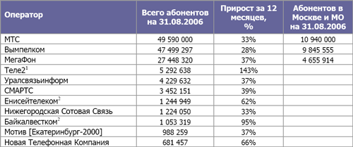 Лишь региональные операторы продолжают демонстрировать рост как абсолютных, так и относительных показателей. Их совокупная доля в годовом приросте доходов выросла до 12% (I полугодие 2006 по отношению к I полугодию 2005), а темпы роста доходов достигли 30% в годовом исчислении. Положительная динамика региональных операторов определяется как относительно слабой насыщенностью некоторых из рынков, на которых они работают (например, регионы Сибири), так и успешной конкуренцией крупнейшего регионального оператора, Теле2, с "большой тройкой". На долю Теле2 приходится около 40% роста абонентской базы региональных операторов и 50% роста их доходов. Ведущие федеральные и региональные операторыВысокие темпы прироста абонентской базы двух активов Сибирьтелекома – Байкалвестком и Енисейтелеком – привели к перераспределению позиций операторов на российском рынке. В июле Енисейтелеком занял седьмое место, обогнав нижегородского оператора НСС. Уже в конце 2006 – начале 2007 г. впереди НСС (на восьмом месте среди всех сотовых операторов) может оказаться Байкалвестком, который ранее, в июне, обошел по количеству абонентов екатеринбургского оператора Мотив.