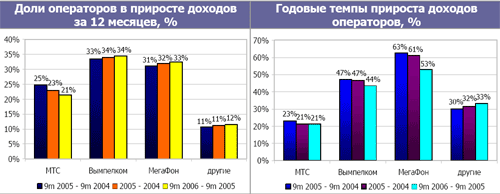 Лидером рынка по доходам остается МТС: за 9 месяцев 2006 г. доля оператора составила 32%, тогда как Вымпелкома – 30% и Мегафона – 25%. По сравнению с 9 месяцами 2005 г., в январе – октябре 2006 г. доходы сотовых операторов увеличились на $2.7 млрд., из которых на Вымпелком пришлось 34%, лишь на 1% отстал Мегафон – 33%, доля МТС – 21%. За 9 месяцев 2006 г. темпы прироста доходов МТС [9 мес. 2006/9 мес. 2005] сохранились на прежнем уровне – 21%, тогда как у Вымпелкома и Мегафона они сократились, но, тем не менее, остались на довольно высоком уровне – 44% и 53% соответственно.
