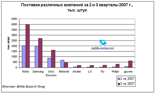 Российский рынок терминалов в III квартале 2007 годаСтатистика. Официальные продажи терминалов на российском рынке составили 10320 тысяч терминалов (Здесь и далее приводятся данные sell-in компаний производителей), в то время как во втором квартале 2007 года объем поставок был равен 5965 тысяч терминалов. Рост продаж составил 73 процента. По сравнению с третьим кварталом 2006 года продажи увеличились на 23 процента. Объем серого рынка в третьем квартале составил 3.1 процента. Термин «серый рынок» в существующих реалиях должен обозначать исключительно контрабандный товар, который поставляется, минуя все официальные каналы. Средняя цена модели в третьем квартале составила 109.45 Евро, она стабильна на протяжении четырех кварталов с тенденцией к незначительному росту. Рынок замещения по итогам квартала составил 89 процентов. Объем рынка в 2007 году оценивается MRG на уровне в 30-31 миллионов штук. Краткое описание ситуации. Российский рынок перестал следовать четким сезонным продажам, потребление телефонов не имеет пиков, в отличие от прошлых периодов. Это привело к хорошим продажам в самом начале года, но стагнации в середине, особенно летом. Большинство игроков пересмотрело свои прогнозы, они оценили максимальный объем рынка на уровне 28 миллионов аппаратов. В то же время в третьем квартале последовал всплеск как оптовых продаж, так и розничных. На фоне исчезновения и постепенного уменьшения продаж оптовых компаний на протяжении 2006 и начала 2007 года создалась парадоксальная ситуация. Для небольших, независимых розничных игроков в регионах стало проблематичным закупать оборудование. В то же время рентабельность их бизнеса выросла за счет сокращения числа крупных игроков на рынке, отсутствия ценовых войн, высоких цен на телефоны. На этом фоне компании, традиционно продававшие телефоны мелким оптом, смогли нарастить свои продажи, как минимум вдвое нарастить обороты в течение третьего квартала. Возникла новая цепочка дистрибуции, которая резко увеличила емкость рынка как в оптовом, так и в розничном канале. По мнению MRG, данное явление не носит постоянного характера, оно временное. Ожидать, что стагнация рынка сменится плавным ростом, нельзя, предпосылок для этого нет. Косвенным признаком, подтверждающим это мнение, является стабильность средней цены телефона. На протяжении 4 кварталов средняя цена телефона незначительно увеличивается. В третьем квартале можно было ожидать ее падения на фоне возросших поставок производителей второго эшелона. В частности, компании Alcatel, для которой средняя цена телефона находится на уровне 36 Евро. Но компенсация произошла за счет первой четверки игроков, в ней нарастили продажи моделей среднего и высокого ценовых диапазонов все компании, лучшая маржа была у Motorola, но ради этого производитель пожертвовал долей рынка (4.3%). Фактически компания Motorola находится в нижней точке, дальнейшее падение продаж невозможно, но компания ощущает острую нехватку продуктов. Благодаря ее переориентированию на маржу, а не на долю рынка, появилось пространство для таких игроков, как Alcatel, Philips, Sagem. Эти компании активно нарастили свои продажи в третьем квартале, для них они стали рекордными. Если для Alcatel результаты квартала обусловлены также возобновлением сотрудничества с Евросетью, то для других игроков – исключительно потребность