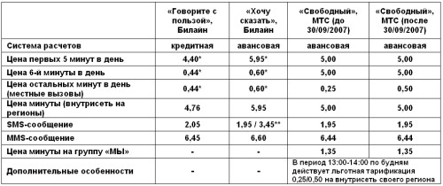 Тарифные новости апреля: уточненная информация и продолжение темыНаш предварительный материал смотрим здесь, сегодняшний можно считать итоговым анализом предложений со «скользящей шкалой цены» на рынке. Плюс некоторые уточнения и добавления, почти все базовые цифры и основные выводы остаются без изменений. «Страна на связи» Билайн. Действительно, в новой версии тарифа появляется ограничение в размере 3000 минут исходящей междугородней связи по России. Иначе и быть не могло после введения такого же антифродового барьера на «Бизнес без границ» МТС. В отличие от МТС, в Билайн условия для действующих абонентов не меняют, и ограничения распространяются только на новые подключения (информация пресс-службы компании). Т.е. Билайн страхуется от перетока нелегальных узлов междугородней связи из МТС и от образования новых «операторов дальней связи» на основе своих безлимитных тарифов. «Свободный» МТС. Тариф оказался еще любопытнее, чем мы описывали. Присутствует дополнительный «бонус» в виде дешевых («льготных») звонков внутри сети МТС своего региона по будним дням в обеденное время (с 13:00 до 14:00). Выглядит как своеобразный тариф внутри тарифа: «счастливый час внутри сети» предоставляется 5 раз в неделю вне зависимости от количества выговоренных ранее пятирублёвых минут, но и в подсчете шести не-льготных минут эти разговоры не участвуют. Т.е. в случае финансовых затруднений не обязательно платить по 5 рублей за первые шесть минут разговоров в день, можно попытаться за час обеденного времени утрясти вопросы хотя бы с абонентами МТС своего региона. Хотя с учетом естественного позиционирования тарифа (активное деловое общение по рабочим дням) предоставление «счастливого часа» именно в будни выглядит в большей мере маркетинговым приемом. Еще одна особенность тарифа – все звонки на телефоны МТС группы «МЫ» тарифицируются по 1.35 руб./мин. и не участвуют в подсчете шести не-льготных минут. «Говорите с пользой» Билайн. Полный список параметров тарифа смотрим здесь, новый корпоративный тариф будет действовать с 15 апреля 2007 года. Основные особенности тарифного предложения: