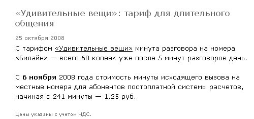 Билайн «Хочу Удивить»: сага номер триТретья попытка привести в порядок образовавшуюся удивительную путаницу во всяких тарифных вещах. Хочу сказать, тот еще детектив устроили. С переодеваниями, неожиданными исчезновениями и прочей непременной атрибутикой жанра. В итоге вроде бы все устаканилось и мы с вами получили искомый конечный продукт. Лирическое отступлениеРезонный вопрос: с какой стати я пишу уже третий текст по поводу тарифных приключений «Хочу сказать» и «Удивительные вещи»? А с учетом «базовых» обзоров как минимум пятый. Думаете, придраться больше не к чему? Ничего подобного. Во-первых, во всех этих многоходовых комбинациях со скоропостижными вводами/выводами тарифов с их переименованиями и взаимопревращениями действительно черт ногу сломит. А разобраться надо. Во-вторых, интересно понаблюдать за бушующими африканскими страстями вокруг этих тарифных предложений. А бушует все это дело так, что волны регулярно на официальный сайт выплескиваются и образовавшиеся лужи приходится лихорадочно подтирать. В-третьих, сами по себе тарифы мне нравятся. Эти предложения как раз и ориентированы на многих из тех. кто читает Mobile-Review. В данном конкретном случае на тех, кто тратит на связь достаточно много, но при этом намерен распорядиться деньгами рационально. Речь не о патологическом стремлении сэкономить, а о желании получить максимум возможного за потраченное. Пусть даже в какой-то мере из спортивного интереса. Такая позиция не всегда радует оператора, но лично мне глубоко симпатична. Ну-с, приступим к подведению окончательных (надеюсь) итогов. Окончательная версия?![]() Начнем с новости, опубликованной… Нет, не скажу когда. Сформулируем так: новость обозначена 25-м октября, а уж когда появилась на сайте – неважно. Во всяком случае, 25, 26 и 27 числа ее на сайте не было точно. Ладно, простим маркетологам эти очередные игры в машину времени. В прошлый раз нам обещали завершить пластическую операцию над тарифами 25 октября, будем считать, что им это удалось. А вот сама новость… Мы с вами хорошо знакомы со схемой расчетов на предоплатных и постоплатных тарифах Билайн. В постоплатных версиях речь обычно идет о количестве минут в месяц, предоплатные тяготеют к схеме ежедневного учета. Например, как в условно-безлимитном тарифе: 85 минут в день на предоплатной и 3000 минут в месяц на постоплатной версии. И как прикажете понимать текст: «С 6 ноября 2008 года стоимость минуты исходящего вызова на местные номера для абонентов постоплатной системы расчетов, начиная с 241 минуты — 1,25 руб.»? Выговорил 240 минут и дальше до конца месяца все звонки по 1,25 руб.? Ладно, не будем придираться, речь идет о 240 минутах в течение суток. Хотя на всякий случай уточнить пришлось, а то мало ли... ![]() Поехали дальше. Идем по новостной ссылке в описание тарифа и потихоньку начинаем сомневаться в собственной вменяемости. 5,95 руб. за первые 5 минут всех разговоров, после чего до конца дня 0,60 руб. за звонки на Билайн и 2,15 руб. – за остальные местные вызовы, хороший такой тарифчик сверстали. А как же обещание сохранить прежней стоимость всех услуг? Нехорошо получается. И что, над этим хитрым маневром думали аж две недели? Уже начал расписывать параметры такого своеобразного «переименования» тарифа, но ближе к вечеру описание изменилось, актуальную на сегодняшний вечер версию можно 