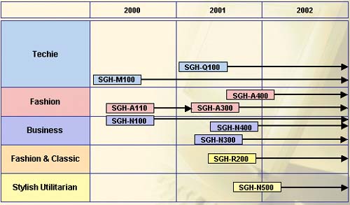 Казалось бы, простое деление, но модель R200/R210 компания относит не к Connector, а к Fashion, при этом другая модель, а именно N400, вполне правомочно размещается между сегментами Fashion и Business. Такое расположение обусловлено тем, что N400, обладая всеми функциями, присущими аппаратам бизнес-класса, имеет необычный внешний вид и автоматически выдвигающуюся антенну, которая делает его похожим скорее на игрушку, нежели на “серьезный” телефон. К этому же классу, который можно назвать Stylish utilitarian, относится и модель N500. Аппараты среднего уровня в компании Samsung часто выделяют в сегмент Fashion&Classic. ![]() С весны 2003 года компания приняла новую классификацию. Последними аппаратами, подпадающими под старую классификацию, стали - A800, R210, N620, S500, T400. Начиная со второго квартала 2003 года, приняты новые обозначения всей линейки.