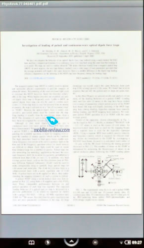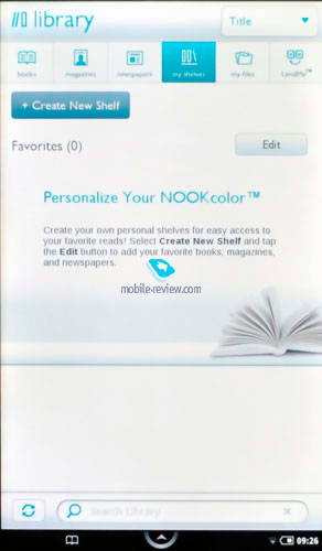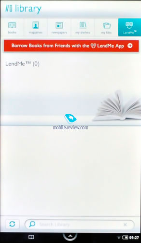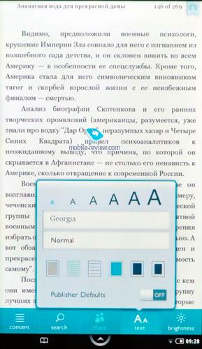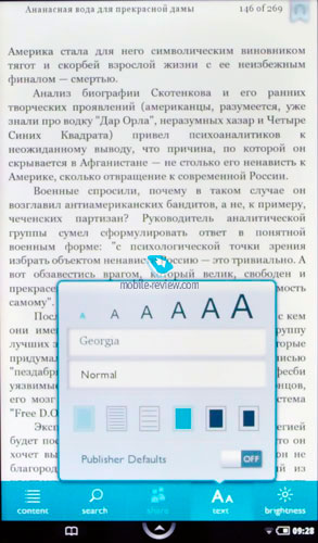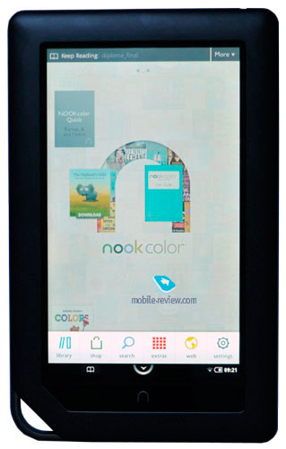 ЭкранОсновное, что есть в электронных читалках – это, на мой взгляд, экран. В NOOKcolor используется качественная IPS-матрица, её разрешение 1024x600 точек, диагональ – 7 дюймов. Несмотря на то, что заявлено наличие антибликового покрытия, экран бликует. Тут не стоит надеяться на чудо, экраны на основе электронных чернил относятся к ярким источникам света лучше по умолчанию. В остальном, экран для портативного устройства отличный: хорошая цветопередача, широкий диапазон регулировки яркости подсветки (впрочем, при минимальном её уровне заметно мерцание), неплохие углы обзора. На касания сенсорная подложка реагирует, к сожалению, не очень хорошо – но это после iPad и iPhone, если привыкнуть прилагать некие минимальные усилия – проблем не возникает. ![]() ИнтерфейсПоскольку из аппаратных клавиш всё, что есть – это две кнопки и качелька регулятора громкости, большее время общение с NOOKcolor происходит с помощью сенсорного интерфейса. Дизайнеры используют преимущества большой IPS-матрицы, все элементы прорисованы качественно, размер кнопок удобен для нажатия. Разблокировка происходит, как на большинстве сенсорных устройств – нажимаем на кнопку на лицевой панели (или на левом торце), проводим пальцем по экрану – и начинаем общаться с читалкой. На экране разблокировки есть часы. Поскольку основная функция – это чтение книг, на информационной полоске внизу экрана, помимо кнопки вызова меню, часов, индикаторов Wi-Fi и заряда аккумулятора, расположена кнопка перехода к чтению открытой книги, это удобная мелочь. ![]() Кнопка меню позволяет перейти к библиотеке, магазину книг (разумеется, для покупок потребуется ввести номер своей пластиковой карты), поиску по устройству, приложениям, интернет-браузеру и опциям. Библиотека стилизована под книжную полку, можно создавать списки книг, просматривать журналы и газеты, на которые есть подписки. Есть также функция просмотра содержимого устройства, своеобразный «проводник» по файлам. Также в библиотеке есть функция LendMe, она позволяет «одолжить» купленную книгу у знакомых пользователей Nook. Чуть подробнее о поиске, он есть как по всему устройству целиком, так и по библиотеке. Проблема лишь одна, но серьёзная – русской клавиатуры нет, так что для русскоязычных пользователей поиск, по большей части, бесполезен. Чтение книг и просмотр файловПрограммное обеспечение, отвечающее за чтение, разработано на основе решения Reader Mobile от Adobe Systems. Это не столь важная информация, но Barnes&Noble специально это подчёркивают. Поддерживаются форматы EPUB (включая файлы с DRM) и PDF. Помимо этого, можно просматривать различные документы, такие как XLS, DOC, PPT, TXT, графические файлы - JPG, GIF, PNG, BMP. Поддерживается просмотр видео MP4, прослушивание музыки в форматах AAC и MP3. ![]() Всё это можно без каких-либо конвертаций и программ синхронизации закачивать на встроенную память устройства, объём которой 8 ГБ (изначально свободно около 5.5 ГБ), или на карту памяти (которую придётся докупить). Скорость закачки файлов на встроенную память – порядка 5 мегабайт в секунду. При подключении к USB-порту компьютера NOOKcolor сразу начинает заряжаться, но как съёмный диск определяется лишь после того, как происходит разблокировка экрана. Поговорим о самом приложении для чтения книг. При его вызове в первый раз на экране появляется подсказка, какие зоны экрана за какие функции отвеч