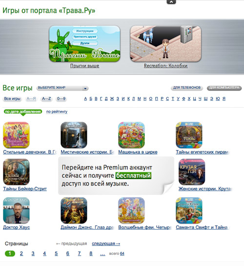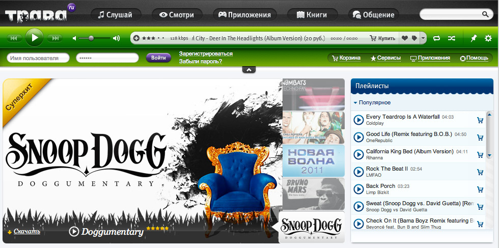 Трава и людиТрава – штука для человека очень полезная. На ней приятно поваляться в знойный полдень, некоторые типы травок сушат и используют в качестве приправ и лекарств. Без травы буквально никуда. Но есть и еще одна «трава», называется Трава.ru. Это такой портал, созданный компанией «МегаФон» для всех, кто любит музыку, игры, видео, книги и другие приятные развлечения. Сегодня мы познакомимся с порталом, а в следующих статьях поговорим подробно о возможностях этого ресурса. Травушка-муравушкаЧтобы использовать портал Трава.ru, нужно набрать в адресной строке браузера trava.ru, это вполне логично. Прежде чем вам откроется волшебный мир мультимедиа, рекомендуем расслабиться, налить в высокий бокал какой-нибудь освежающий напиток, отключить звук телефона и вообще ощутить исходящие от мира позитивные вибрации. Поехали. Главная страница сайта перед вами, и пока вам непонятно, что и как здесь происходит. Давайте я расскажу. В верхнем меню есть ссылки на типы контента, это музыка (слушай!), видео (смотри!), приложения, книги. Там же находится ссылка на записи пользователей, ММС и новости. Прямо под меню находится пульт управления воспроизведением – главный пульт «Травы» - кнопки перемотки, остановки и начала воспроизведения, окошко текущей композиции. Здесь вы можете поставить треку оценку, купить, добавить песню в плейлист (и задать этому плейлисту имя). Рядом кнопки активации произвольного воспроизведения, включения повтора, настройки. А еще для пользователей портала предусмотрен специальный плеер для установки на компьютере, вы можете собрать плейлист и затем слушать музыку, не открывая браузер! Еще ниже - поля для ввода логина и пароля, имеет смысл сразу же зарегистрироваться, это даст вам массу удобств, начиная с плейлистов, заканчивая многими другими полезными возможностями. Тут же ссылки на корзину, сервисы, приложения, помощь. Про приложения мы поговорим позже. Ну а теперь о том, что вы можете здесь делать. Если выбран пункт меню «Слушай», то в центре страницы отображаются популярные альбомы и композиции. Рядом плейлисты, можете сразу выбирать трек и переходить к прослушиванию. Прямо под «главным» окном ссылки на те треки, что сейчас играют на компьютерах или мобильных устройствах других пользователей сервиса, еще ниже меню быстрого перехода к той или иной музыке, видео, книгам, приложениям. Например, вы слушаете сказку «Петя и волк», и вдруг вам захотелось что-нибудь посмотреть веселое, так сказать, отвлечься от судьбы этого мальчика. Пожалуйста! Выбирайте себе клип и смотрите на здоровье. Любую композицию вы можете скачать, оплатить можно с помощью SMS или электронными деньгами. Но есть и другие способы, особенно будут рады абоненты «МегаФона», об этом мы поговорим в следующий раз. Просмотр на травеТеперь давайте выберем пункт меню «Смотри». Мир видео перед вами! В верхней части находятся рекомендованные клипы, вы можете быстро выбирать нужный, используя полосу прокрутки. Ниже - все видео, здесь вы с помощью меню выбираете нужный жанр: тут и триллер, и фанк, и «Гилберт», и все, что душа пожелает. Видео воспроизводится во встроенном плеере, ролик легко можно скачать. Рядом с окном воспроизведения указывается качество клипа, размер, длительность, есть кнопки для «расшаривания» видео в Twitter и Facebook, счетчик скачавших. Роликов на «Траве» 
