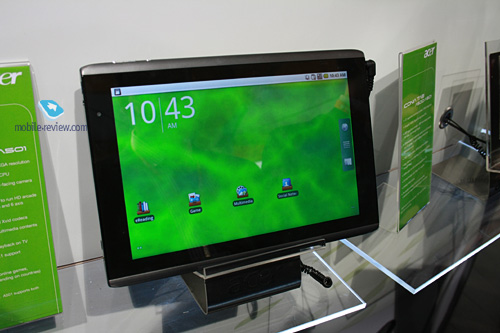 ![]() ![]() ![]() ![]() ![]() ![]() ![]() ![]() ![]() ![]() Во многом аналог A100, но с экраном большей диагонали и разрешения, а также с рядом улучшенных характеристик. В частности, в этом планшете больше памяти и есть функция USBHost для подключения носителей или, например, мышки. В России в продаже в апреле по цене 20 000 рублей. Acer ICONIA TAB W500Планшет на базе Windows 7, работает на платформе AMD C-50 (1GHz,DDR3 1066 MHz), есть графический чип (AMD Radeon HD6250), SSD диск на 32 ГБ, 10,1" экран с разрешением 1280x800 точек. ![]() ![]() ![]() ![]() ![]() ![]() Вместе с планшетом идет классная клавиатура, при помощи которой (вставив в нее планшет) можно превратить всю эту связку в неплохой рабочий ноутбук. Также на стенде Acer демонстрируется ноутбук с двумя экранами, у меня по поводу этого чуда комментариев нет, только фото. ![]() ![]() ![]() ![]() ![]() ![]() ![]() Ну а гвоздь программы Acer, это android-смартфон ICONIA Smart. И о нем мы поговорим подробнее в отдельном материале. ![]() Ссылки по теме