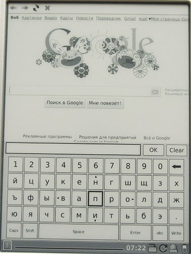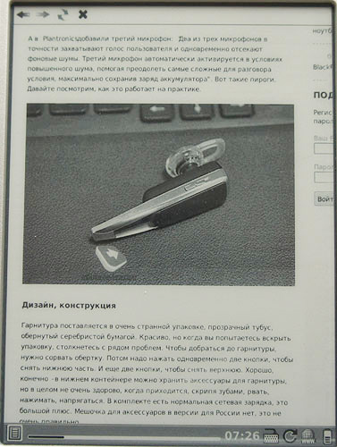 Дизайн, конструкцияПростая упаковка, на коробке перечислены все основные достоинства устройства, начиная от комфортного экрана, заканчивая поддержкой Wi-Fi. Разберемся по ходу дела, так ли это. Комплект поставки аскетичный, но здесь есть все, что нужно. Во-первых, хочу отметить длинный USB-кабель, может быть, его не очень удобно использовать с ноутбуком, но зато это правильно при подключении сетевого адаптера, не у всех розетки находятся в пределах видимости. Белый чехол из кожзама не сильно увеличивает размеры устройства, есть кармашек для визиток или еще каких карт, книгу легко достать, крепление надежное и простое. ![]() ![]() ![]() ![]() ![]() Теперь давайте поговорим о самом устройстве. Крышка аккумулятора из металла, это приятно. Лицевая часть пластиковая, стилус вверху, на нижней части находятся разъем miniUSB, миниджек, слот для карты памяти SD. Сборка хорошая, ничего не скрипит. Придерусь разве что к расположению светового индикатора, он находится над джойстиком, не особо изящно. Лучше бы его переместили на торец. Размеры книги составляют 197 х 124 х 11,6 мм, весит 298 грамм. Книга существует в двух вариантах, белая и черная. ![]() ![]() ![]() ЭкранДиагональ дисплея 6 дюймов, разрешение 800 х 600 точек, 8 градаций серого. Экран резистивный, нужно использовать стилус с фторопластовым наконечником. Книги читать приятно, текст отображается комфортно - здесь дело в разрешении, бумага контрастная, создается впечатление, что читаешь обычную книгу. Иногда электронная бумага может быть блеклой или текст может казаться размытым, как ни настраивай, здесь такого нет. ![]() В режиме ожидания на дисплее в нижней части отображается индикатор заряда батареи, слева - маленький индикатор, если нажать, то откроется меню настройки рабочего стола. Тут можно выбрать отображение элементов - это миниатюры, подробный вид или список. Ниже - быстрый переход к настройкам, фильтры по имени, типу, размеру, времени доступа, рейтингу. В нижней части поворот дисплея, безопасное извлечение карты памяти, переход к музыкальному плееру, активация режима ожидания или отключение устройства. ![]() Путаница, вот что приходит на ум после беглого ознакомления с меню книги. Например, часы отображаются во время чтения, но в режиме ожидания их нет. Музыкальный плеер доступен в дополнительном меню, но в общем списке не отображается. ![]() УправлениеНа правом торце находится кнопка включения Wi-Fi, на нижнем - качелька регулировки громкости, кнопка включения. С пятипозиционным джойстиком дела обстоят так, он отвечает за переход в меню, возврат, переход от страницы к странице - но в главном меню невозможно переходить от пункта к пункту, как ни пытайся. Это, на мой взгляд, не вполне логично. Джойстик не хрустит, нажатия со щелчком. Кнопка menu вызывает список дополнительных действий во время чтения файлов или при работе других приложений. Соответственно, для перемещения по меню нужно использовать стилус. ![]() ![]() ![]() ИгрыЗдесь есть судоку, вот и все, что я должен сказать про игры. ![]() ![]() ПриложенияВ приложениях есть календарь и часы, вот и все, что я должен сказать про приложения. ![]() ![]() Чтение и поддерживаемые форматыПожалуй, лучше я приведу списком все файлы, что может открыть Onyx Boox: FB2, FB2.ZIP, DOC, DOCX, XLS, XLSX, PPT, PPTX, PDF, EPUB, DjVu, TXT, TXT.ZIP, HTML, RTF, RTF.ZIP, MOBIPOCKET (Non-DRM), CHM, PDB, CBZ, CBR, CB7, JPG, PNG, GIF, BMP, TIFF, MP3. Не думаю, что так уж важны музыкальные файлы или фо