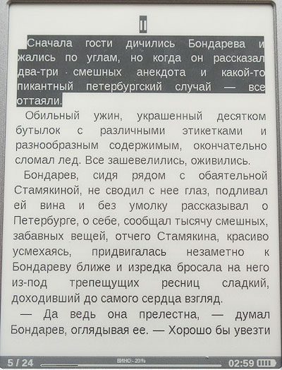 В одной из статей я уже говорил, компания Pocketbook за не такой уж и большой срок превратилась в интернационального «монстра», книги марки пользуются популярностью в разных странах, и нельзя, вне зависимости от личных предпочтений, не отдать должное ответственным за успех людям. В 2011-ом году линейка уже сложилась, основная тенденция - выход парных продуктов, отличия могут заключаться в наличии сенсорного дисплея, 3G-модема. Таковы модели Pro 602 и 603, Pro 902 и 903. Еще из «обновок» - появление книги на базе операционной системы Android, условно этот продукт можно назвать книгой, но на самом деле это что-то вроде планшета. Обзор появится в ближайшем времени. Отмечу упаковку, она изменилась и в лучшую сторону, с каждой из книг поставляются чехлы, причем все они похожи, отличаются по размеру. Меню обычных книг используется и в IQ700, этакая повсеместная унификация. Давайте сегодня посмотрим, насколько хороша 603-я в жизни и что в ней привлекательного (и какие есть слабые стороны, конечно). ![]() ![]() Дизайн, конструкцияС дизайном дела обстоят так - даже глядя издалека можно догадаться, что перед нами электронная книга. Марку не угадаешь. На мой взгляд, с развитием Pocketbook дела наладятся, но есть ведь характерная только для «покетов» модель 360 (например), вот ее узнаешь издалека. Да, у 602-ой нет столь узнаваемых кнопок, да и размер побольше, но она какая-то безликая, не имеет своего лица. Хотя, уверен, для большинства это не имеет значения. Корпус из пластмассы, передняя панель серая, сзади верхняя часть голубая, крышка темно-серая. Весит книга 280 грамм, размеры 182 х 132,3 х 11 мм. Сборка хорошая, ничего не скрипит и не болтается, чтобы снять крышку, приходится приложить определенные усилия. Вам придется это сделать, если вы захотите использовать 3G-модем. Тут, правда, есть другой момент, аккумулятор прикручен, понадобится отвертка (есть в комплекте). ![]() Сверху слева спрятан короткий стилус, закреплен он, судя по всему, на магните. На нижней части находится кнопка сброса, вход 3,5 мм, аккуратный световой индикатор, разъем microUSB, слот для карт памяти microSD. ![]() Пластик мне показался достаточно устойчивым, я носил книгу в сумке без чехла, царапин не появилось (хотя она там не пребывала в гордом одиночестве). Но после небольшого пешего путешествия по центру города на крышке остались отпечатки букв от журнала, одеколон и ватка спасли меня. Они всегда спасают. Что бы я ни имел в виду. ![]() В общем и целом, к внешнему виду, сборке претензий нет, все на месте. Ну а любители (ценители) дизайна пусть смотрят на книги Sony. ДисплейДиагональ дисплея 6 дюймов, разрешение 600х800 точек. Экран сенсорный, мало того, очень и очень резистивный (простите за выражение). То есть, на нажатие пальцем не реагирует. Или надо, чтобы палец был очень и очень тонкий. Посему, используйте стилус, ну а если потеряете - не беда! Стилусов на свете полно. Бумага мне поначалу показалась блеклой, но после использования в течение нескольких дней привык. В меню можно настроить сглаживание. С углами обзора все в порядке. ![]() УправлениеНа верхнем торце находится кнопка включения, она же отвечает за блокировку всех элементов управления. Там же, но с другой стороны, рычажок включения беспроводных интерфейсов. При длительном нажатии, соответственно, следует выключение. Справа от экрана кнопка перелистывания, возврата в главное меню и многофункци