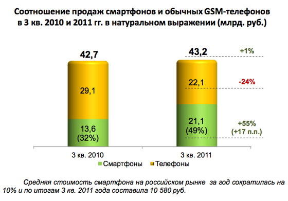 Рынок смартфонов в РФ. Версия Связного. 9 месяцев 2011 годаРоссийский рынок сильно отличается от европейского, а также американского, и причина в том, что операторы пока не очень активно субсидируют мобильные телефоны, да и прямые субсидии отсутствуют. Опыт американского рынка показывает, что доля смартфонов в продажах может составлять более 70 процентов, и в этом нет ничего удивительного. Более того, большее проникновение смартфонов - это необходимый залог успеха для контент-провайдеров, операторов с их сервисами, сторонних компаний, разрабатывающих услуги. До бума смартфонов в России наблюдалась обратная картина, рынок был впереди европейского по проникновению смартфонов, но уже несколько лет назад мы начали сильно отставать. В этом аспекте интересно, что в России довольно уникальная ситуация, мы между Востоком и Западом. С одной стороны, повторяем американский опыт, с другой, некоторые марки представлены плохо, например, Blackberry. Это показывает, что российский рынок уникален, тем более что исторически доля Windows Mobile была максимальной именно на нашем рынке, так как китайские компании штурмовали Европу через Россию. До европейского рынка многие не добрались, но в России осели. Как результат, восприятие телефонов от Microsoft в России на качественно ином уровне, чем где-либо, даже в США. Уникальность рынка проявляется и в этом. Для розничных сетей смартфоны стали ключевым товаром еще несколько лет назад, наценка на таких телефонах максимальна, к ним можно продавать дополнительные услуги, и они, как правило, радуют своих владельцев. В Связном продажу смартфонов считают приоритетом и заостряют внимание на этом, в частности, постоянно обновляют свое видение рынка и того, что на нем происходит. С подавляющим большинством цифр в отчетах Связного можно согласиться, а также они предлагают очень интересный взгляд одной из крупнейших сетей на рынок. Поэтому отчеты такого толка имеют не только теоретический, но и практический интерес, из них видно, что рынок принимает и какие аппараты продаются лучше. Давайте взглянем на цифры, которые опубликовал Связной в отчете, и поговорим о них. Начнем. Доля смартфонов в России неуклонно растет, в 3 квартале 2011 года она выросла на 72 процента по сравнению с тем же периодом 2010 года и составила 19% (в 2010 – 12%). Обычные телефоны уступают смартфонам, их доля в третьем квартале сократилась на 3 процента. Исходя из этого может возникнуть вопрос, вытеснят ли в итоге смартфоны обычные телефоны. Думаю, что это маловероятный сценарий, так как недорогие телефоны по-прежнему занимают львиную долю рынка (более 50 процентов). И такая ситуация сохранится и в будущем. Но я верю в то, что смартфоны займут как минимум половину рынка в перспективе нескольких лет, этот процесс будет ускоряться. Интерес розничных сетей к смартфонам объясняется просто, это самый лакомый кусок рынка, уже сегодня в деньгах это половина рынка. ![]() ![]() Половина рынка в денежном выражении, несмотря на падение средней стоимости продаваемого смартфона, в 3 квартале, по мнению Связного, средняя цена смартфона составила 10 580 рублей. Основной вклад в падение средней цены смартфона внесла компания Nokia, именно она в отсутствие сенсорных моделей была вынуждена снижать цены на свои Symbian-устройства, которые попали в ценовую группу от 3 до 5 тысяч рублей. Годом ранее смарт