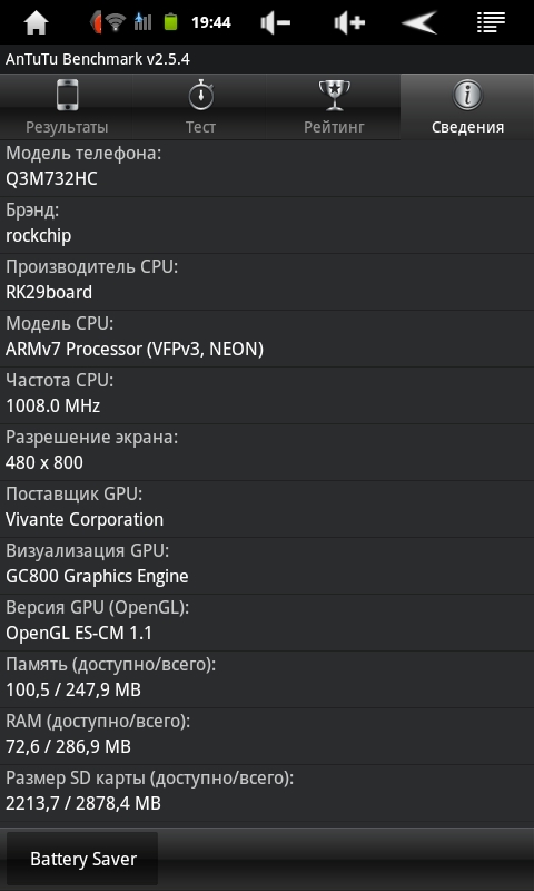 ПроизводительностьВ планшете используется процессор RockChip RK2918, его частота 1200 МГц. Оперативная память — 512 МБ, внутренняя память 4ГБ (используется твердотельный накопитель, средняя скорость копирования 5МБ/с), она поделена на два раздела, 1,2 ГБ отведено под систему и приложения, 2,8 ГБ отведено пользователю для загрузки различных файлов. Радует, что производитель не стал экономить на внутренней памяти и пользователю не нужно переживать о том, что все его приложения не уместятся в системной памяти. Скорость работы не вызывает нареканий: никаких тормозов, никаких зависаний.