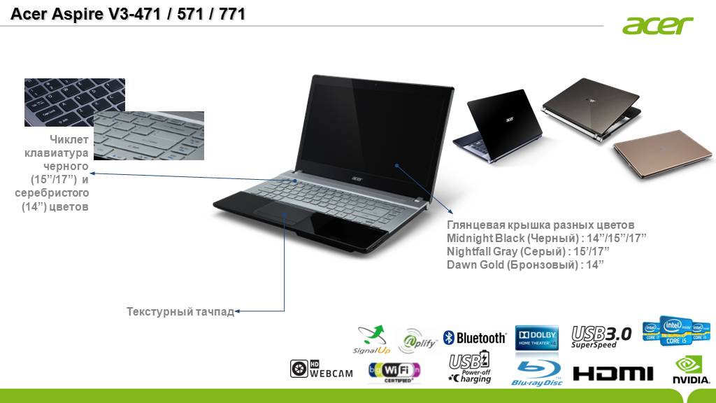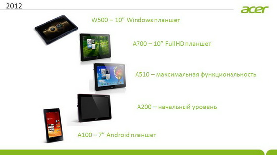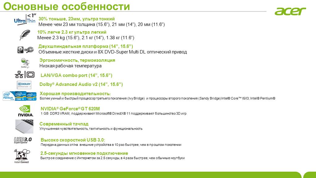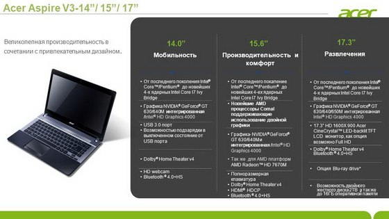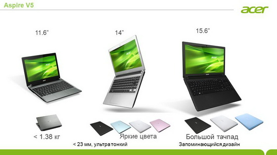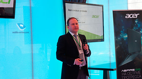 Пресс-конференция AcerВ качестве места проведения мероприятия был выбран ресторан GLOBO, находящийся в центре Арбата. Приятное и просторное помещение вместе с окнами во весь рост создают хорошую атмосферу. На диванчиках можно было пообщаться с другими журналистами перед началом конференции. ![]() ![]() ![]() Начало конференцииПервым слово взял Григорий Низовский – вице президент корпорации Acer и руководитель в регионах России, Восточной Европы и Турции. Много информации из его презентации было посвящено увеличению доли Acer на рынках в различных странах. ![]() Продолжил конференцию Денис Кутников – региональный менеджер Acer, а также генеральный директор российского офиса Acer. Его часть была посвящена доле Acer в России и планам компании на будущее. Он рассказал о том, что Acer занимает в России первое место по продажам десктопов и второе по ноутбукам, планшетам и мониторам. Компания планирует вернуть себе лидерство в сегменте ноутбуков, улучшить свои позиции по мониторам и десктопам, а также увеличить свою долю на рынке планшетов. ![]() ![]() Следующая часть конференции была посвящена непосредственно новой линейке ноутбуков и их позиционированию. О ней рассказывал Вячеслав Иващенко – директор департамента мобильных ПК Acer. Он начал с интересного графика, в котором все пользователи ноутбуков условно разделены на пять частей. ![]() ![]() Рационалисты. Люди, выбирающие ноутбук исключительно по соотношению цена/качество. Бренд для них не играет никакой роли. Игры/мультимедиа. Пользователи, которым нужно мощное решение для развлечений. Как правило, для таких целей используется ноутбук с большой диагональю, который почти никогда не переносят. Мобильный офис. Сюда относятся те, кому постоянно нужен ноутбук для работы, связанной с текстом, например, журналисты. Для них важны компактность, время автономной работы и удобная клавиатура. Профессиональные приложения. Пользователи, которым по работе нужно взаимодействовать с тяжелыми приложениями, но при этом они хотят от устройства мобильности. Мобильный пользователь. Пользуется ноутбуком от случая к случаю, например, в кафе или других общественных местах. В этот сегмент попадают пользователи планшетов. Для каждой из аудиторий у Acer нашлось своё решение. Начнем с категории «Мобильный офис», для нее в Acer приготовили две серии ноутбуков S5 и S3. Серия S5 - это флагман среди ультрабуков от Acer. По данным Acer, является самым тонким ультрабуком в мире. Его толщина 11 мм, а вес 1,35 кг. Ноутбук мгновенно включается (1,5 секунды) и почти так же быстро подключается к интернету (2,5 секунды), помимо этого в S5 добавили порт Thunderbolt. Внешне модель выглядит потрясающе тонкой, будто держишь один из тонких планшетов. Серия S3 ориентирована на пользователей, которые готовы смириться с чуть большей толщиной, чуть более медленным включением, но со значительно меньшей ценой. Модель S3 уже у нас на тесте, первые впечатления: тонкий и быстрый ноутбук с отличным дизайном и металлическим корпусом. ![]() ![]() ![]() ![]() Вторая категория - «Мобильные приложения». Для пользователей, входящих в нее, в Acer приготовили две линейки: M5 и М3. Обе линейки отличаются использованием отдельной видеокарты NVIDIA® GeForce® GT 640M, полноразмерной клавиатурой и большим временем автономной работы. В старшей модели также добавлена подсветка кнопок. В Acer говорили о поддержке моделями бо