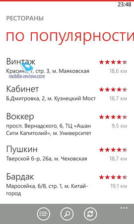 Рестораны. Информация о ресторанах предоставляется в зависимости от выбранного вами фильтра, можно просмотреть ближайшие места, лучшие из ближайших или отфильтровать все рестораны по кухне, станции метро и среднему счету. При просмотре конкретного ресторана доступны его контактные данные, а также фотографии и рецензии пользователей.
