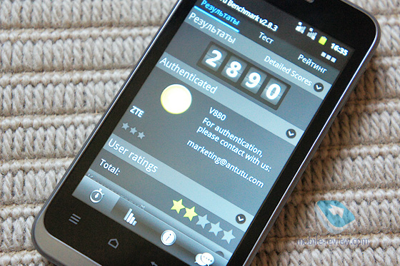 Я проверил производительность устройства с помощью программы AnTuTu, хорошее, кстати, приложение, созданное нашим разработчиком. В итоге аппарат получил 2890 баллов, результаты можете видеть на скриншотах. В сравнении с некоторыми конкурентами, ZTE V880E (при измерении в AnTuTu) показывает гораздо лучшую производительность. Впрочем, тесты тестами, но и в реальной жизни V880E ведет себя хорошо, прокрутка рабочих столов плавная, основные приложения запускаются быстро. ![]() ВыводыАккуратный смартфон на Android с двумя SIM-картами, практичный, удобный, стоит около 8000 рублей. А можно найти и дешевле. Работа с двумя SIM-картами реализована просто, но функционально, все работает. Интересно будет посмотреть, что изменится с появлением обновления до Android 4.0. Аппарат ладно скроен, крепко сшит и за свои деньги более чем интересен - особенно для тех, кто уже не может ходить с двумя телефонами одновременно, заряжать их, беречь, холить и лелеять. Лучше холить и лелеять ZTE V880E, где в недрах скрываются сразу две SIM-карты и море позитивных вибраций - я бы посоветовал компании не останавливать работу над своей оболочкой и, хочется верить, скоро появится аппарат с двумя активными радиомодулями от ZTE (какая там понадобится батарейка, ума не приложу). Ну а V880E смело могу рекомендовать к покупке, за свои деньги он хорош. Сергей Кузьмин (skuzmin@mobile-review.com) |
