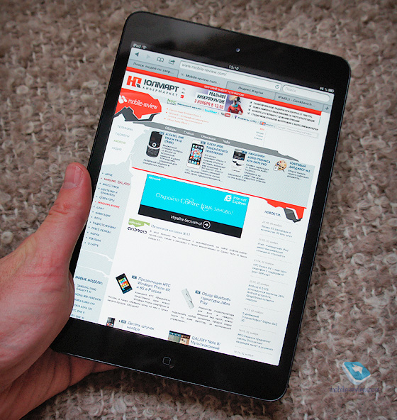 Как и в случае с iPod mini, я хочу отметить крохоборство Apple. Казалось бы, ну почему не положить в комплект сразу EarPods? Ведь понятно, что человек будет использовать планшет в том числе и для музыки, и для разговоров в Skype или по FaceTime. Непонятная традиция не добавлять в комплект гарнитуру началась еще с первого iPad и продолжилась в этом году. Вам придется либо купить гарнитуру отдельно, либо использовать то, что есть. Я бы советовал именно EarPods, видимо, есть какие-то настройки и они делают звук наушников в паре с планшетом очень даже хорошим. Впрочем, касается это и iPhone, и iPod. ![]() ![]() Коробочка очень маленькая, сделана из картона, раза в два меньше упаковки обычного iPad. Больше всего напоминает коробку Kindle. Да и сам планшет больше всего напоминает электронную книгу, поначалу вообще необычно воспринимать это как iPad. Удобно держать одной рукой, легко помещается в карман куртки или даже в задний карман джинсов. Естественно, это очень удобно, особенно для тех людей, кто часто использует планшет в общественном транспорте. Тут дело даже не только в том, куда iPad mini можно спрятать. Когда вы читаете книгу или играете, удерживая устройство двумя руками, то его не очень-то и видно. Особенно если это mini черного цвета. Корпус полностью черный, и задняя часть, и рамка вокруг дисплея. Издалека и не поймешь, что это. Отмечу, что здесь корпус unibody, сделан из алюминия, металл приятно холодит руку. Сзади корпус матовый, дисплей прикрывает стекло с олеофобным покрытием. Отпечатки хорошо заметны и спереди, и сзади, хотя черный цвет неплохо маскирует. За два дня активного использования царапин пока нет. Мне лично дизайн очень нравится, штучка из тех, что вроде бы и не нужна, но хочется иметь под рукой - хотя как вписать mini в экосистему, плохо представляю. Учитывая, что есть и обычный iPad, и MacBook Air. ![]() ![]() Аппарат существует в двух цветах, черный и белый, видел оба, мне черный нравится больше, но и белый тоже. Вообще, он не белый, рамка вокруг дисплея такого цвета, а сзади корпус серебристый. ![]() Напоминает оформление iPhone 5. Как мне кажется, этот вариант явно для девушек. У версии с радиомодулем на задней части есть пластиковая заглушка антенны, у версии с Wi-Fi корпус полностью из металла. ![]() На нижней части корпуса - отверстия динамика (или динамиков), разъем Lightning, сверху - разъем 3,5 мм, микрофон. Точные размеры - 200 х 134,7 х 7,2 мм, вес - 308 грамм. Версия с радиомодулем весит 312 грамм. ![]() ![]() ![]() ![]() ![]() ![]() ![]() ![]() Громкость динамиков достаточна для прослушивания музыки или для просмотра видео, но лучше использовать гарнитуру. ![]() ДисплейДля начала - факты, диагональ дисплея 7,87 дюйма, разрешение 1024 х 768 точек. На презентации все связанное с разрешением тщательно обходили стороной, еще бы, во времена Retina показывать «революционный» гаджет с обычным экраном. ![]() Теперь лирика. Самое больное место устройства - дисплей. Как ярый любитель техники Apple, могу придумать множество оправданий экрану и компании, но... Но на самом деле, если вы пользовались iPad с Retina, то сразу поймете. Дисплей тут отвратителен. Плох. Парни в Apple приучили нас видеть красивые буковки, словно нарисованные на экране. Они же приучили нас радоваться резкости, яркости. И вот я вижу словно слегка размытые буквы на экране mini. Смотрю фильм, но мозг занят другим, а именно сравнением с обычным iPad, где тот же фильм смотрится на порядок лучше. Молчу про фото