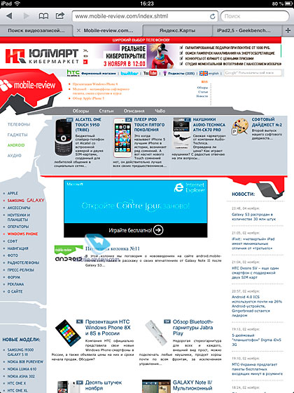 Старый конь борозды не испортит, да не такой уж он и старый. Планшет работает шустро, причем касается это не только базовых приложений, но и игр. На скриншотах можете видеть, какие игрушки я запускал, ни с одной не было проблем. Но по скорости запуска, да и по скорости вообще обычный iPad (как его называют, «третий») все равно мне кажется лучше. ![]() ![]() ![]() ![]() ![]() ![]() ![]() Вот несколько скриншотов из программы, что измеряет производительность. Специально для тех, кому нужны графики! Больше графиков! ![]() Есть тут Bluetooth, версия 4.0, есть Wi-Fi. С подключением проблем не было. Беспроводные наушники использовать можно и нужно, мой выбор - Parrot Zik.