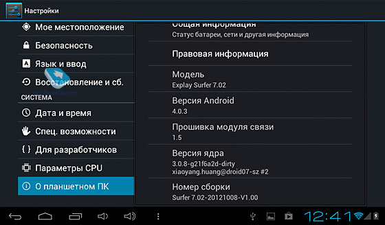Antutu benchmark ![]() NenaMark II ![]() Antutu 3D rating ![]() Basemark Taiji Программная платформаУстройство работает на одной из последних версий Android ICS – 4.0.3. Версия прошивки модуля связи – 1.5, версия ядра 3.0.8-g12f6a2d, номер сборки 7.02-20121008-V1.00. Фирменная оболочка отсутствует. ![]() Более подробно с Google Android Ice Cream Sandwich вы можете ознакомиться здесь (/review/google-android-4-part1.shtml). ![]() ![]() ![]() ![]() ![]() ![]() Веб-браузерУстановлен стандартный просмотрщик интернет-страниц Android 4.0. Так как аппарат базируется на ARMv7-архитектуре, то поддерживается работа с Flash. Есть браузер Chrome. Скорость загрузки средняя, страницы скролятся относительно плавно, однако в целом как-то не очень приятно пользоваться: то ли из-за мелких лагов, то ли из-за невысокой чувствительности сенсорной панели. ![]() ![]() ![]() МультимедиаМузыкальный проигрыватель Привычный Android-плеер. В настройках, к сожалению, не оказалось параметров звуковых эффектов. Громкость в наушниках высокая, качество традиционное для подобных планшетов на Android. Громкость динамика средняя, но слушать музыку или смотреть фильм на расстоянии до метра теоретически комфортно. Если прикрыть отверстие динамика, то громкость упадет на 50%. ![]() ![]() ![]() Форматы воспроизведения аудио: MP3, OGG, WAV, FLAC, APE, AAC Видеоплеер Он поддерживает практически все форматы и кодеки видео: AVI, 3GP, MP4, RM/RMVB, FLV, MKV, MOV, TS, M2TS (FullHD/1080p); MPEG1/2/4, H.264 / VC-1 / XviD / DivX. ![]() ![]() ЗаключениеНе так давно тестировал планшет Ritmix RMD-740, и он мне очень понравился, в первую очередь, небольшими габаритами и отличным экраном. Его стоимость на данный момент составляет около 4 500 рублей. Планшет Explay Surfer 7.02 за 4 990 рублей, хотя и не может похвастаться толщиной корпуса в 8.5 мм и весом 290 граммов, зато на его борту стоит двухъядерный процессор и приличное количество оперативной памяти в объеме 1 ГБ. Отдельно стоит сказать, что в комплект производитель положил не только чехольчик, но и кабель синхронизации, а также OTG-кабель. ![]() У компании Explay получилось отличное устройство с идеальным соотношением цены и качества. Крайне рекомендую! Плюсы: