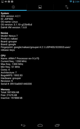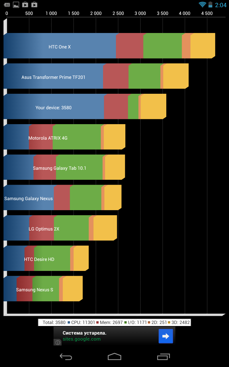 ![]() ![]() Планшет удобно держать как одной, так и двумя руками, придраться можно разве что к толщине, конечно же, хотелось бы, что она была на уровне Galaxy Tab 7.7. ![]() ![]() ДисплейВ Nexus 7 используется семидюймовая IPS-матрица с разрешением 1280х800 точек. Экран прикрыт стеклом Gorilla Glass. Поддерживается мультитач до десяти одновременных касаний. Несмотря на то, что IPS-матрицы уже начали появляться в бюджетных устройствах (например, в IconBIT Matrix), большинство из них имеют меньшее разрешение (1024х600 точек или 1024х768 точек), хотя бывают и исключения, к примеру Ainol Fire. ![]() В первом взгляде я писал о том, что картинка экрана была невысокого качества. Но видимо нам тогда показывали инженерный образец. В тестируемом сейчас Nexus 7 никаких претензий к экрану нет: естественные цвета, высокая яркость, большие углы обзора. К четкости также никаких претензий. Минимальная яркость комфортна для чтения в темноте, максимальная избыточна в большинстве случаев. После бюджетных планшетов, экран в Nexus 7 очень радует глаз. ![]() ПроизводительностьЭто первый семидюймовый планшет на NVIDIA Tegra 3, что дает ему сразу множество преимуществ. Предлагаю коротко пройтись по уже известным достоинствам Tegra 3: