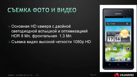 ![]() ![]() Ascend P1Самый тонкий смартфон в линейке, его толщина всего 7,69мм. На практике же смартфон не ощущается очень тонким, сложно сказать с чем это связано. Но делать окончательные выводы по поводу ощущений мы будем только в обзоре. В Р1 установлен "чистый" Android 4.0 с некоторыми косметическими изменениями. Добавлена поддержка Dolby Mobile Plus. Крышка аппарата сделана из белого пластика, отпечатки на нем почти не видны. ![]() В модели используется 4,3" экран с QHD-разрешением 960х540 точек, тип матрицы - Super AMOLED, Pentile присутствует, но в глаза не бросается. За защиту от царапин отвечает стекло Corning Gorilla. Сам экран яркий, четкий, в общем вызывает только положительные эмоции. ![]() Используемый процессор - двухъядерный TI OMAP 4460 с частотой 1,5 ГГц, подобный процессор используется в Samsung Galaxy Nexus и планшетах Archos серии G9. Модель работает быстро, столы листаются без всяких подтормаживаний. ![]() У аппарата две камеры — основная 8 МП и фронтальная 1,3 МП. ![]() Выход Р1 намечен на июль, ориентировочная цена менее 20 тысяч рублей. По характеристикам Р1 является прямым конкурентом HTC One S. На стороне Р1 более низкая цена и наличие слота для microSD карт. У One S более интересные материалы корпуса плюс наличие нового HTC Sense. Нам модель понравилась, собрана она хорошо, претензий к сборке нет, здесь многое зависит от цены и того, сколько будут стоить конкуренты в июле. ![]() С живыми фотографиями устройства и видеообзором вы можете ознакомиться ниже. ![]() ![]() ![]() ![]() ![]() ![]() Ascend D1/D QuadФлагман компании, в который она постаралась вложить все имеющиеся наработки и идеи. Начнем с экрана, в модели установлен 4,5" IPS+ экран с разрешением 1280х720 точек, прикрытый стеклом Corning Gorilla. Экран имеет меньший запас яркости, чем Super Amoled, но при этом отображение цветов более спокойное. Нам экран понравился, изображение с него выглядит четким, цвета естественными, а яркость высокой (хоть и ниже, чем в Super Amoled). ![]() Смартфон имеет две камеры — основную 8 МП и фронтальную 1,3 МП. ![]() Заявлена поддержка Dolby Mobile и технологии улучшения качества звука earsmart. ![]() ![]() Будет доступно две модификации смартфона D1 и D Quad. В D1 установлен двухъядерный процессор от Texas Instruments c частотой 1,5 ГГц, а в D Quad - четырехъядерный процессор собственного производства - Hi-Silicon K3V2 с частотой 1,5 ГГц. В компании обосновывают использование своего процессора тем, что в тестировании производительности он показал лучшие результаты. Несмотря на такую мощную начинку, при листании столов и меню приложений, наблюдались небольшие подтормаживания, возможно их исправят в финальных прошивках. Модель будет поставляться с установленным Android 4.0 с небольшими изменениями от Huawei. ![]() Цена на D1 будет в районе 20 тысяч, дата выхода - июль. ![]() D Quad выйдет в октябре, примерная цена 21-22 тысячи рублей. Модели получились интересными, D1 и D Quad - реальные конкуренты для существующих флагманов, все будет зависеть от разницы в цене, так как при равной цене, пользователь скорее предпочтет Samsung или НТС. Видеообзор и живые фотографии смартфона ниже. ![]() ![]() ![]() ![]() MediaPad FHDНа стенде был так же представлен новый планшет от Huawei, главной особенностью которого является Full HD IPS экран с разрешением 1920х1200 точек. Картинка действительно выглядит потрясающе, на обоях было изображение с капельками дождя, каждая капля выглядела как живая. В то же время, я не могу сказать, что экран вызывает "вау-эффект", он действительно хорош, но н