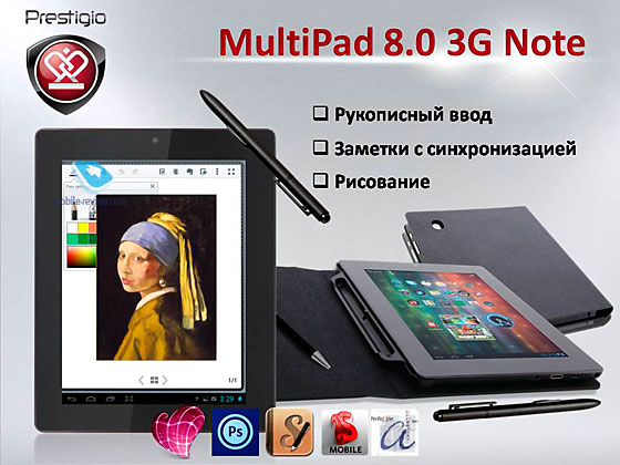 Prestigio MultiPad 8.0 3G Note Второй представленной моделью был восьмидюймовый планшет, главной особенностью которого, как вы можете видеть из его названия, является наличие стилуса. ![]() ![]() ![]() ![]() При этом у 3G Note довольно интересный стилус. Одна его сторона похожа на обычный стилус от Wacom, а другая — на тоненькую ручку. Тонкая часть работает благодаря электромагнитному покрытию экрана. На одном из торцов есть специальный переключатель, который включает это покрытие. После включения экран обрабатывает только нажатия стилусом и не реагирует на пальцы. Также для планшета будет предустановлено несколько программ для работы со стилусом, например EverNote. ![]() ![]() От стилуса плавно переходим к внешнему виду. Лицевую сторону планшета сложно как-то видеоизменить, поэтому и 3G Note спереди ничем особым не выделяется, а вот спинка планшета очень порадовала. Она выполнена из матового прорезиненного пластика, приятного на ощупь. Приятно, что в Prestigio уделили внимание используемым материалам. ![]() ![]() ![]() ![]() ![]() В комплекте с планшетом идет чехол-книжка. На мой взгляд, это один из лучших чехлов, идущих в комплекте к планшету. Это не простая кожаная поделка, а красивый аксессуар. С внешней стороны обложка выполнена из материала, чем-то похожего на бархат. Внутри есть специальное отделение для стилуса. ![]() ![]() ![]() Диагональ экрана — восемь дюймов, разрешение — 1024х768 точек, тип матрицы — IPS. Экран прикрыт защитным стеклом Gorilla Glass. Поддерживается мультитач, до пяти одновременных касаний. В целом, хороший экран со стандартным разрешением. За производительность отвечает двухъядерный процессор RockChip RK3065, работающий на частоте 1,6 ГГц. Ёмкость внутреннего накопителя — 16 ГБ, объём оперативной памяти — 1 ГБ. Есть слот для карточки памяти. Поддерживается USB-Host. Отдельно порадовал аккумулятор. Его ёмкость 6000 мАч, что весьма впечатляет, обычно такой ёмкостью обладают десятидюймовые модели. Однако из-за такого аккумулятора модель получилась увесистой, по ощущениям, ее вес около 500 грамм. ![]() Планшет работает под управлением Android 4.0, опять же, планируется обновление до Android 4.1. Помимо стандартного Wi-Fi, планшет также оснащен и 3G-модулем. Рекомендованная розничная цена устройства — 12 тысяч рублей. С одной стороны, ценник выглядит немного завышенным, но давайте не забывать, что перед нами один из немногих планшетов с хорошим стилусом, помимо этого, производитель не поскупился на хорошие материалы корпуса и качественные аксессуары.