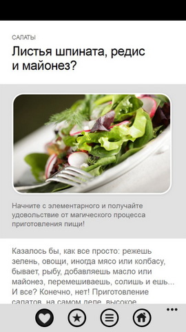 «Начать чтение» открывает первый по содержанию рецепт. Перед вами появляется фотография открытого салата, а под ней… нет-нет, не привычный рецепт, а история происхождения этого салата и особенности, которые он получил у нас в России. И только после этого вам показывают рецепт. Мне очень нравится такой подход, он превращает приготовление пищи из обыденного дела в кусочек искусства. Под рецептом находятся кнопки для быстрого добавления его в избранное, просмотр рейтинга салата, а также переход к содержанию.