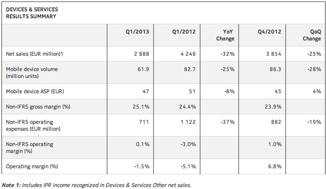 Nokia – очередной рывок вниз, успех в США и КитаеИстория того, как Nokia в сотрудничестве с Microsoft теряет рынок и умирает, для меня потеряла свою остроту какое-то время назад – тогда компания прошла точку невозврата. Единственный вопрос, который в этих условиях может звучать, - когда компания окончательно уничтожит свои продажи и себя. То, что это произойдет, сомнений не вызывает. В финансовых отчетах Nokia последнего времени прослеживается неутомимый PR, который пытается представить ситуацию не как безнадежную, а как нечто идущее по плану. Вот только веры в эти планы нет ни у кого на рынке, даже самые неисправимые оптимисты начинают задавать вопросы – а что, собственно, происходит. К своему стыду, я не ждал отчета Nokia, как это происходило еще год назад – более того, я его чуть не пропустил. Отметив про себя этот факт, поговорил с коллегами – большинство отметило, что для них Nokia уже стала производителем второго эшелона и большого интереса не вызывает. Учитывая, что с 2010 года я конспектирую все этапы разрушения Nokia и подробно описываю события, было бы обидно забросить эту работу на последнем отрезке существования компании. Поэтому, собрав силы в кулак, расскажу об отчете Nokia и о том, какая ложь вскрылась после его публикации. Выручка Nokia за первый квартал 2013 года составила 5.85 миллиарда евро, в отчете компании говорится о том, что она прибыльна по операциям без учета налогов, и это преподносится как достижение. В реальности это заявление не должно смущать, так как убыток Nokia за квартал составляет 150 миллионов евро, что не выглядит маленькой суммой, но значительно меньше, чем 1.34 миллиарда евро за тот же квартал годом ранее. За прошедший год в Nokia сократили большую часть разработчиков, инженеров, отказались от многих заводов и продали множество подразделений – это и сказывается на том, что компания теряет не так много денег. Более того, в первом квартале 2013 года компания активно торговала своими активами, что также внесло свой вклад в «позитивную» динамику. Этим объясняется и рост активов компании с 4.37 до 4.38 миллиарда евро. Но давайте взглянем на то, как продаются телефоны – основа бизнеса Nokia, эти цифры расскажут совсем иную историю. Смотрим в табличку. Из таблички видно, что продажи в денежном выражении упали на 32 процента от года к году, а в штучном выражении - на 25 процентов (61.9 миллиона штук). Но давайте посмотрим, за счет чего падали продажи и как.