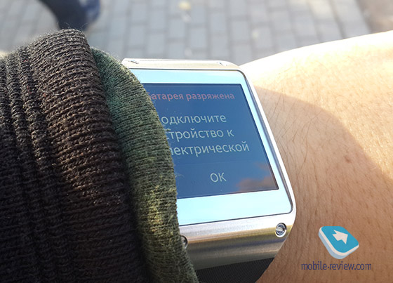 Основная проблема Samsung Gear вовсе не в технической реализации или не только в ней, проблема кроется в том для чего создавали эти часы. Их не пытались сделать удобными, не исследовали то, как люди будут пользоваться ими. Их пытались сделать первыми, и эта задача была решена с блеском. Но решая эту задачу, было невозможно сделать так, чтобы часы стали еще и удобными – нельзя быстро и качественно создать продукт в той категории, где вы не умеете этого делать. Это маловероятно. В подробном обзоре я расскажу о своих нареканиях относительно часов, но если говорить коротко, они мне совсем не нравятся. Это сырой продукт, с множеством видимых и скрытых проблем (локализация сделана частично, управление запутанное и сложное, есть зависания телефона!). Но с точки зрения идеи мне претят часы, которые пишут вам о том, что их заряд закончился и нужно подзарядить их. Заявленные 25 часов работы часы выдерживают, но очень часто ты их забываешь поставить вечером на зарядку, что утром оборачивается разряженным устройством. Еще один забавный момент, связанный с часами: в магазинах Samsung можно их покрутить, но они показаны с зарядным устройством – видимо, чтобы не разряжались. Выглядит это вот так.