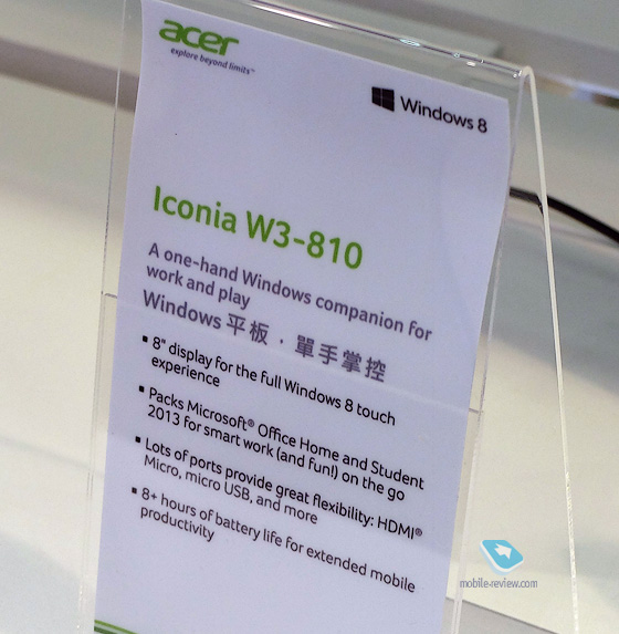 Computex 2013. Новинки AcerУ Acer и Asus одни из самых крупных стендов на Computex, и это понятно, для компаний данная выставка является домашней, здесь они стараются показать себя в первую очередь. Обе компании, кстати, схожи и в выборе пути развития, как и Asus, Acer на Computex 2013 представляет, в основном, развитие текущих продуктов и их улучшенные версии. Хотя, есть и кое-что новенькое. Acer Iconia W3-810Компактный планшет с экраном диагональю 8.1” и разрешением 1280х800 точек работает на базе полноценной ОС Windows 8, что сразу поднимает его на ступеньку выше всех одноклассников, то есть компактных планшетов на Windows RT и Android. В отличие от последних, Iconia W3-810 позволит работать с документами в полной версии MS Office и устанавливать софт для Windows.