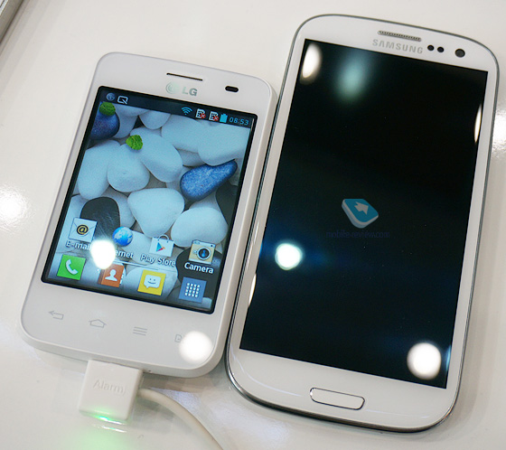 Среднего, LG Optimus L5 II, я пропущу по причине скукоты смертной, а вот про L3 II хочется немного рассказать. Это очень компактный, но пухлый смартфон из матового пластика, фактурного на ощупь и в корпусе со скругленной со всех сторон крышкой. Аппарат буквально падает в руку и больше не хочет оттуда выскальзывать, лежит просто как влитой, несмотря на небольшие размеры. Именно этим он и берет, в остальном перед нами типичный бюджетник с 3” IPS экраном (240x320 точек), 1 ГГц процессором, 512 МБ оперативной памяти, 4 ГБ флеш-памяти и microSD карточкой, с батарейкой на 1540 мАч и 3 МП простейшей камерой.
