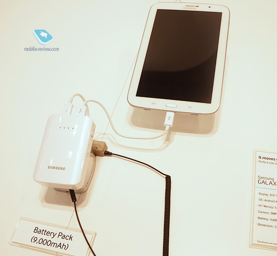 Внешний аккумуляторНебольшой глянцевый «коробок», выполненный в дизайне последних Galaxy. Ёмкость аккумулятора 9000 мАч, при этом сам он выглядит довольно компактно. Планируемая стоимость 40 евро, лично мне этот аккумулятор очень понравился, я бы приобрел себе такой.