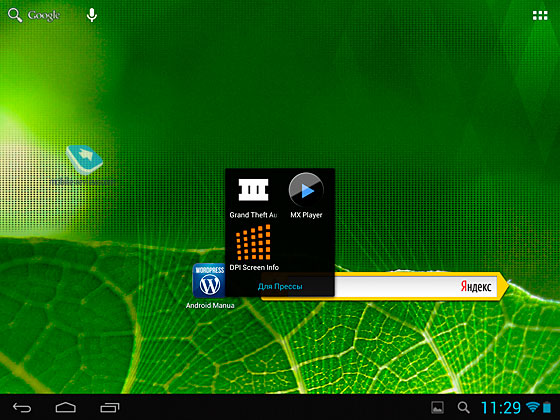 ПроизводительностьУстановлен процессор RK3066 (рабочая частота 1.6 ГГц, архитектура ARMv7a, два ядра Cortex A9 и четырехъядерный ускоритель 3D-графики Mali 400 MP4), используется операционная система Android 4.1.1. Оперативная память 1 ГБ, встроенная память 16 ГБ, доступно 13,36 ГБ. Есть слот для карт памяти microSD, на официальном сайте указано, что поддерживаются карты до 32 ГБ. Есть Bluetooth, Wi-Fi. Как я уже сказал выше, работает устройство странно, при переходе в меню от экрана к экрану есть небольшие задержки, но GTA III запускается и загружается шустро, во время игры тоже все происходит как положено, без натуги. ОсобенностиПоддерживается установка программ из Google Play, как вы можете видеть на скриншотах, многое тут уже есть. Зачем-то поставили антивирус Dr.Web (бесплатная версия), FBReader и другие программы для чтения, ряд игр, приложения для использования социальных сетей, MX Player, карты «Яндекса» и другие программы из тех, что часто люди загружают в первую очередь. Ладно, может быть, это и правильно. Хотя опытные пользователи Android с большей радостью все бы настроили и поставили сами. Радует поддержка «из коробки» ряда видеоформатов, это MKV, AVI, RM, 3GP, MP4, ASF, VOB, MPG, MOV, смело можно загружать в память видео и тут же начинать смотреть.