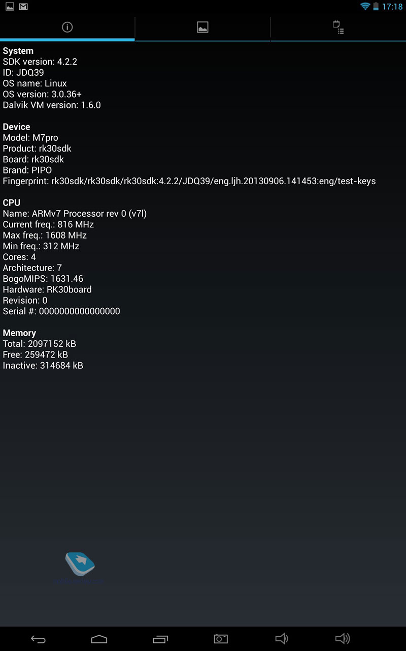 Несмотря на слегка уменьшенные размеры, планшет удобно держать только двумя руками. Операционная системаУстройство работает под управлением Android 4.2.2. Производитель практически ничего не менял в системе, разве что добавил возможности отключения нижней панели и снятия скриншотов кнопкой с нее. ПроизводительностьВ планшете установлен чипсет Rockchip RK3188 с четырехъядерным процессором, работающим на частоте 1,8 ГГц и видеоускорителем Mali-400MP. Объём оперативной памяти — 2 ГБ, ёмкость внутреннего накопителя — 32 ГБ, есть слот для карт памяти. Rk3188 уже давно хорошо зарекомендовал себя в бюджетном сегменте. Вы можете без проблем играть в большинство современных игр без тормозов, правда, некоторые из них будут недоступны в Play Store. В повседневной работе устройство тоже отлично себя показало: браузер, работа с лаунчером, почта и твиттер — со всем этим планшет отлично справился. Автономная работаЁмкость встроенного аккумулятора — 6300 мАч. Цифра хорошая, но не самая впечатляющая. В режиме чтения (яркость 30%, режим «в самолете» включен) планшет разрядился за 9 часов. В режиме видео заряда устройства хватило на 6 часов (максимальная яркость, режим «в самолете» включен). Если говорить о повседневном использовании, то устройство отлично продержится 4-5 дней при часе интернет-активностей с включенным экраном. Беспроводные интерфейсыВ планшете присутствует Wi-Fi модуль (b/g/n), есть поддержка Bluetooth 4.0 и GPS, а также 3G-модуль. Мобильный интернет работает только в режиме модема — звонить с планшета нельзя. К работе Bluetooth и Wi-Fi претензий нет. Холодный старт GPS занимает около двух минут. Напоминаю, что GPS в китайских планшетах плохой, поэтому будьте осторожны при выборе таких устройств в качестве навигаторов. ЗаключениеСтоимость PiPO M7 Pro составляет 8 800 рублей, если речь идет о покупке в России. За эти деньги вы получаете хороший планшет в алюминиевом корпусе, с более компактными габаритами, чем у десятидюймовых устройств, и отличным экраном с высоким разрешением. Также мне понравилось, что в комплект к устройству положили наушники-затычки и не стали экономить на внутренней и оперативной памяти. Прямых конкурентов у устройства нет, однако, если вы рассматриваете и модели без 3G, я бы рекомендовал обратить внимание на Asus MeMO Pad FHD10. Из преимуществ перед M7 Pro стоит отметить олеофобное покрытие и именитый бренд (всё-таки китайцы — это часто «рулетка»). Главный плюс PiPO M7 Pro — наличие 3G-модуля, ведь за 12 тысяч вы не сможете найти десятидюймовый планшет с поддержкой 3G и FullHD-разрешением. Автор выражает благодарность интернет-магазину Eplanshet за предоставленный на тест планшет PiPO M7 Pro.