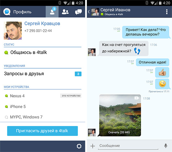 Про AndroidОтдельно хочется сказать про обновление 4talk для устройств на базе Android, если у вас смартфон или планшет на базе данной ОС, крайне рекомендуем попробовать 4talk, этот мессенджер вас приятно удивит скоростью и качеством исполнения. Об улучшениях в текущей версии - прямо по пунктам.