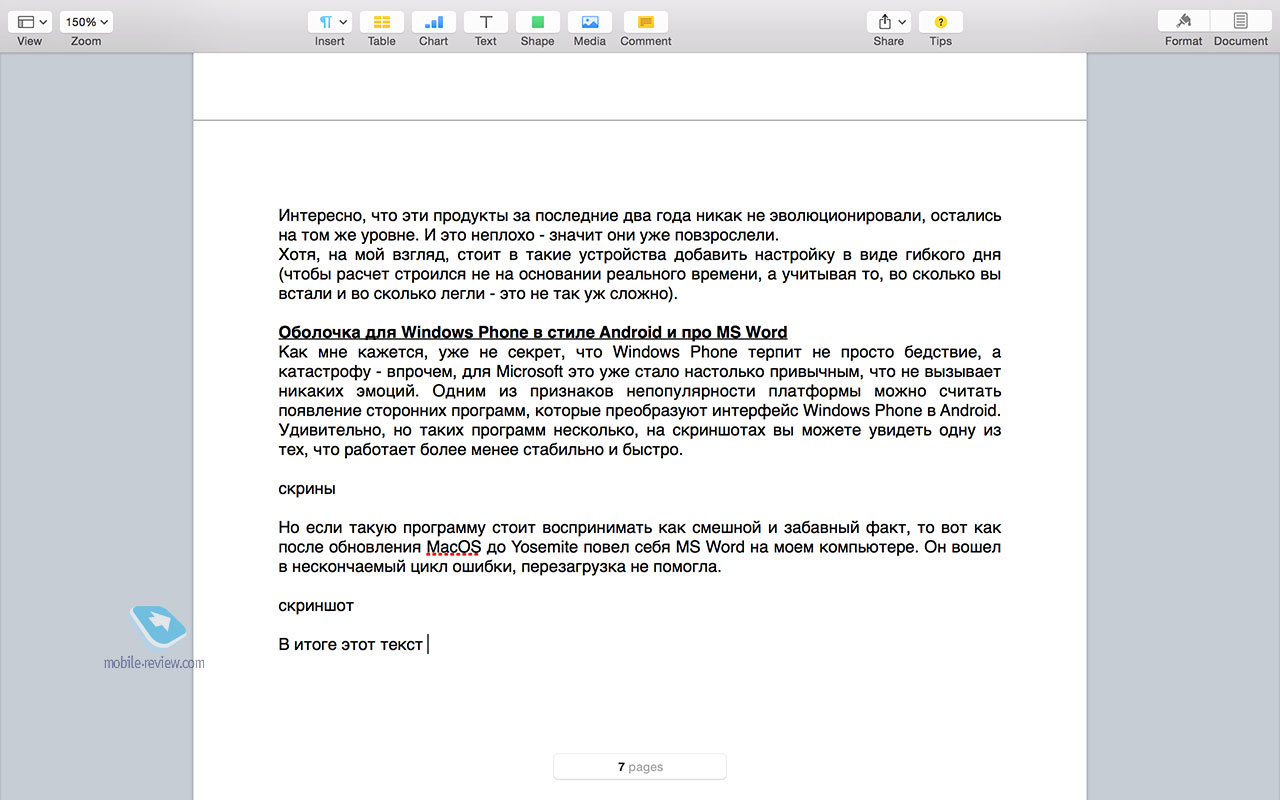 Но если такую программу стоит воспринимать как смешной и забавный факт, то вот как после обновления MacOS до Yosemite повел себя MS Word на моем компьютере. Он вошел в нескончаемый цикл ошибки, перезагрузка не помогла. В итоге этот текст я набираю в Pages, который для этих целей ничуть не хуже, изначально стоит на MacBook. Смешно, что купленный мной MS Office теперь мне фактически не нужен, оставлю его на одной тестовой Windows-машине. Именно из таких мелочей и складывается восприятие марки, а также такие “мелочи” толкают на то, чтобы не мучиться и сменить софт на тот, что работает и не донимает всевозможными проблемами. Хотел попробовать широко разрекламированную функцию перевода звонков с iPhone на MacBook (Continuity), но по какой-то причине два устройства от Apple не захотели соединяться между собой по Bluetooth, постоянно выдавали ошибку. Возиться и пытаться настроить их не хотелось – займусь этим на досуге, когда выдастся свободная минутка. Потратив около часа на чтение форумов и различные эксперименты, понял, что функция сделана криво, нужно подключение к одной Wi-Fi-сети, исключительно на одной частоте (у меня вот роутер работает в двух диапазонах, теперь надо выставлять вручную каждое устройство?). Много всяких ограничений, с ходу настроить все не получилось. А у вас вышло?