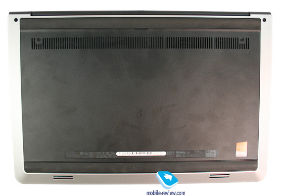 За счет отказа от съемного аккумулятора инженеры Dell получили возможность лучше организовать основную часть нижней половины корпуса. Она более похожа на то, что можно найти в ультрабуках или представителях линейки XPS. Вся нижняя панель прикрыта единым куском черного матового фактурного пластика. В более дорогих моделях она была бы резиновой или софт-тач, но здесь сэкономили. Зато применили другое удачное решение. Вместо традиционных резиновых ножек ноутбук получил два резиновых валика, один из которых округлой, а другой треугольной формы. Благодаря им ноутбук очень устойчив, совсем не скользит. Кроме того, все выглядит аккуратно, и в случае работы на мягкой и неровной поверхности, а также на коленях такое решение более удобно и практично.