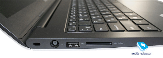 Слева размещены замок Kensigton, разъем для подключения питания, порт USB 2.0 и кардридер. Как уже было сказано, разъемы размещаются довольно плотно, но расстояние между ними достаточно для того, чтобы без проблем пользоваться всеми одновременно.