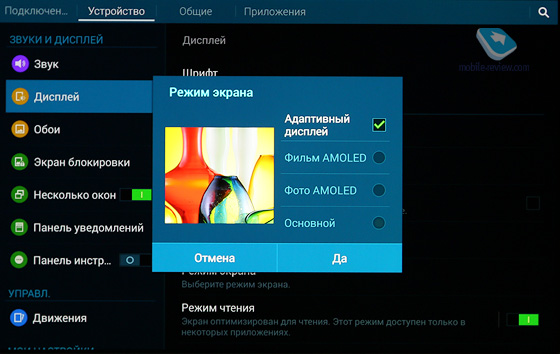 Наконец, мы добрались до самого интересного – режима работы экрана в Galaxy Tab S. Это стандартная настройка для всех устройств от Samsung, оснащенных дополнительным процессором для обработки изображений. В предыдущем разделе я описал принцип работы этого процессора, а тут самое время рассказать о выборе настроек. По умолчанию стоит режим «Адаптивный дисплей», в нем устройство само принимает решение, как должна выглядеть картинка. Она очень яркая, насыщенная, и многие при прямом сравнении с iPad говорят о том, что она красивая, но неестественная.