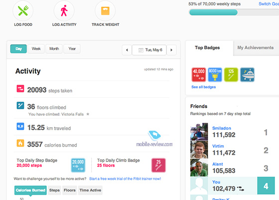 Из минусов в этом устройстве стоит отметить один, но весьма серьезный – свой разъем для зарядки. Если вы потеряете его, то без «хвостика» не сможете подзаряжать устройство. Хватает его в среднем на 6-7 дней работы, что очень неплохо. Типично, что у большинства шагомеров есть социальная составляющая – вы можете не только посмотреть пройденные расстояния на веб-страничке сервиса, но и пригласить друзей посоревноваться. Еженедельно вы видите, кто прошел больше, а кто меньше. Для многих людей это становится побудительной причиной ходить больше, например, отказываться от поездки на машине и заменять ее прогулкой там, где это возможно. В прошлом году на рынке появился шагомер Withings Pulse, в котором реализовано все то же, что и в FitBit One, но проделана огромная «работа над ошибками». Для зарядки используется обычный microUSB-разъем, что очень удобно. Сетевая часть сервиса ровно такая же, выдаются различные бейджики за достижения, можно соревноваться с друзьями. Есть встроенный датчик пульса, работает так себе, это скорее дополнительная функция.