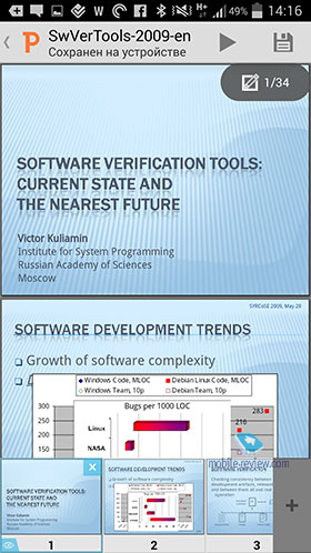 Один из самых популярных офисных пакетов на мобильных устройствах, уже установлен на 120 миллионах устройств и предлагает не только традиционное чтение файлов MS Office, но также чтение электронных книг (интеграция с UB Reader), встроенный графический редактор, печать с помощью Google Cloud Print. В бесплатной версии можно только читать файлы, но для многих этого достаточно. Не бьется форматирование даже сложных документов, поддерживается максимальное число форматов (Open Office, RTF, PDF). Поддерживает максимальное число облачных сервисов – Google Drive, Box.com, Dropbox, SugarSync, OneDrive – все они доступны из приложения. Умеет читать почтовые сообщения в формате MS Outlook (EML). Умеет работать с файловой системой Android, на iOS показывает все места, где могут храниться документы. Из минусов стоит отметить медленную работу на смартфонах с большими текстовыми документами или таблицами, это может стать серьезным доводом против этой программы. Если у вас много файлов на несколько десятков страниц, то работа с ними станет затруднительной. На мой взгляд, это одно из лучших мобильных решений, и оно заслуженно пользуется популярностью, хотя и не лишено изъянов. Для чтения документов хорошо не всегда, а платная версия отлична и перекрывает потребности обычного потребителя на 99 процентов.