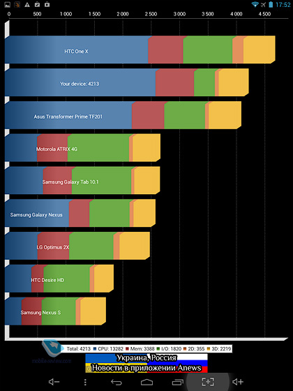 ПроизводительностьВ устройстве установлен чипсет MediaTek MT8389 с четырехъядерным процессором, работающим на частоте 1,2 ГГц, видеоускоритель PowerVR SGX 544MP, объём оперативной памяти — 1 ГБ, ёмкость внутреннего накопителя — 8 ГБ (пользователю доступно 5,5 ГБ), есть слот для карты памяти. Я бы оценил общую производительность планшета на «четверку», присутствуют периодические подтормаживания при листании рабочих столов и добавлении на них новых ярлыков, в остальном же претензий к работе устройства (в том числе и браузера) нет. Рассматривать эту модель как игровое устройство я не рекомендую из-за небольшого объёма внутренней памяти. То есть, вы без проблем сможете играть в простые игры вроде Cute The Rope или Where’s my Water? Но для Asphalt 8 и Real Racing 3 я бы рекомендовал смотреть на более производительные модели (или хотя бы имеющие больший объём памяти). Автономная работаВ планшете установлен несъемный аккумулятор ёмкостью 4000 мАч. В режиме чтения (яркость 30%, режим «в самолете» включен) планшет разрядился за 8 часов.
