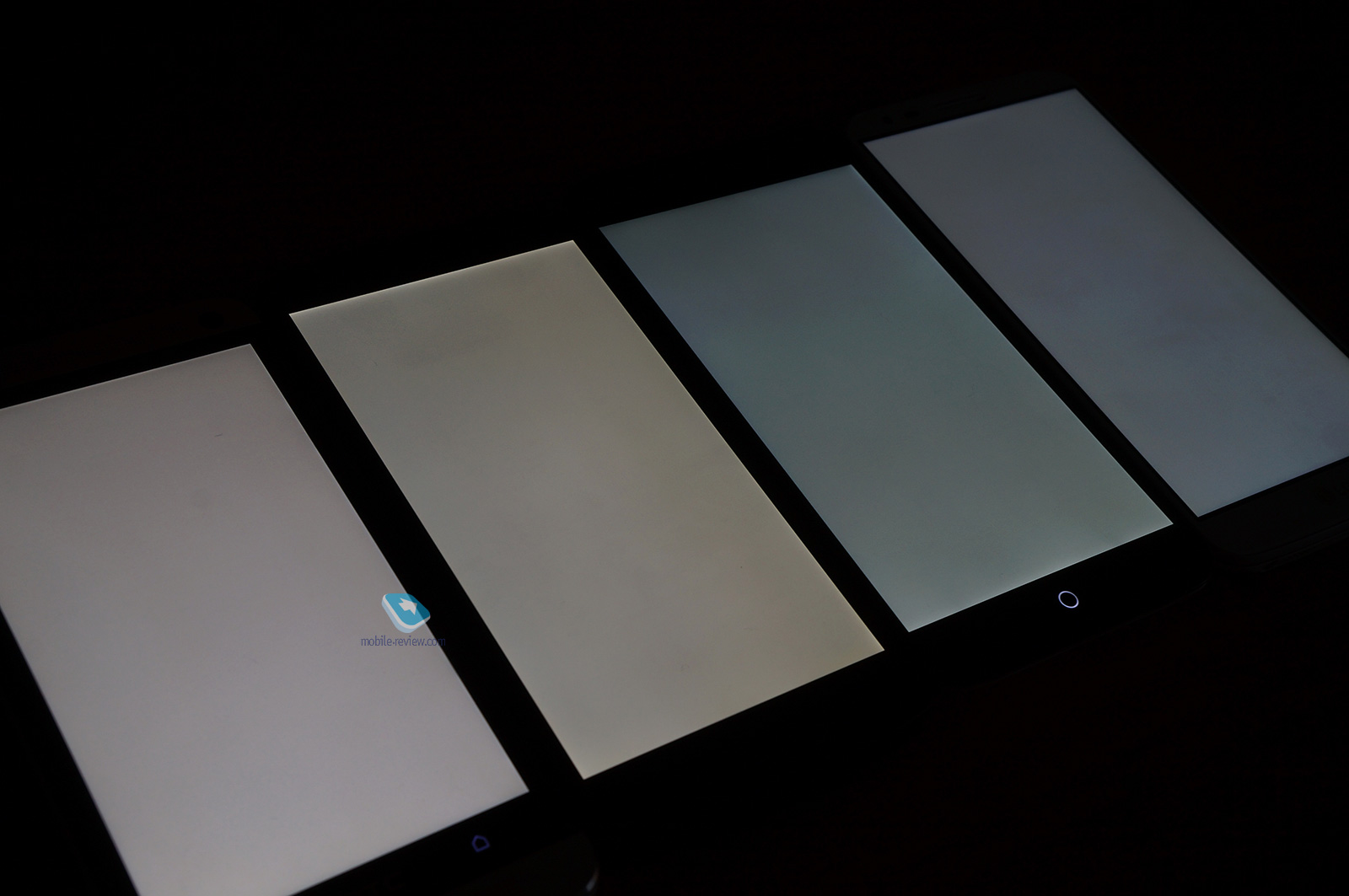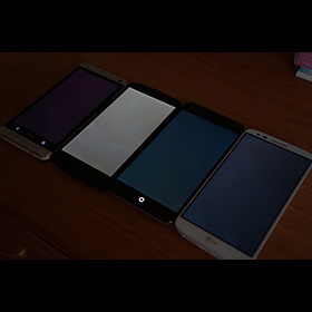 Nexus 5 и HTC One ДисплейВ LG Nexus 5 не стали экспериментировать с диагональю экрана, поэтому поставили стандартную на сегодняшний день диагональ – 5 дюймов (если быть точным, то 4.95"). Для меня это максимально, т.е. если экран более пяти дюймов, то одной рукой пользоваться телефоном сложно. Физический размер дисплея – 62х110 мм, рамка сверху – 12 мм, снизу – 16 мм, а слева и справа – по 3.8 мм. Экран занимает примерно 72% полезной площади, круче только Galaxy S4 (72.1%), LG G Pro (72.8%), Note 3 (74.6%) и лидер – LG G2 (75.7%). Матрица TFT Super IPS+ от Japan Display, разрешение типичное для современного смартфона на Android в ценовом диапазоне от 15 000 рублей – FullHD – 1080x1920 точек. Плотность – 445 точек на дюйм. Конечно же, отдельные пиксели при таком разрешении незаметны. Защищен Gorilla Glass третьего поколения. Ниже представлено несколько фотографий, на которых демонстрируются качества экранов следующих устройств: HTC One, Nexus 5, Meizu MX3 и LG G2 (справа). Под прямыми углами чуть более насыщенная цветопередача у Nexus 5, потом у HTC One, LG G2 и Meizu MX3. Под углами лучше всех справляется экран HTC One, следом за ним Nexus 5, MX3 и LG G2. Максимально чистый белый цвет дает дисплей Meizu MX3 (правда, но скорее уходит в холодные оттенки), далее HTC One, Nexus 5 и LG G2. Лучший черный цвет у HTC One, потом у Meizu MX3, LG G2. А вот с черным цветом Nexus 5 справляется хуже всех, особенно под небольшими наклонами экрана. В общем, могу сказать, что дисплей Nexus 5 лучше, чем дисплей LG G2 (по сути, копии Nexus) – приятней цветопередача, больше углы обзора. Я бы сказал, что экран Nexus 5 не лучший, но и не худший на рынке FullHD-дисплеев. Сенсорный слой емкостного типа (контроллер Synaptics S3350B), без воздушной прослойки. Он отрабатывает до 10 одновременных касаний. Чувствительность очень высокая.