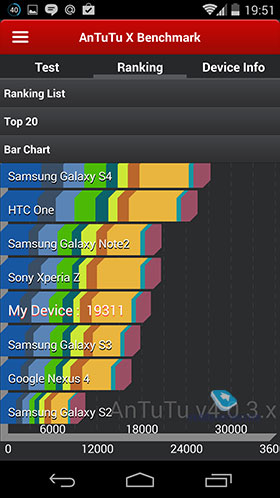ПроизводительностьКак и большинство современных аппаратов, LG Nexus 5 снабдили одним из самых современных чипсетов компании Qualcomm – Snapdragon 800. В качестве вычислительного процессора выступает MSM8974 (ARMV7, 28 нм) с 4-мя ядрами Krait 400 с тактовой частотой 2.26 ГГц, а за видео отвечает мощный движок Adreno 330 с тактовой частотой 450 мГц. Думаю, здесь комментировать особенно нечего – все летает!