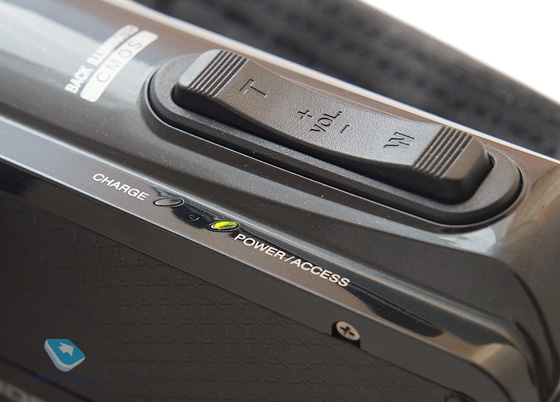 Сверху расположена крупная клавиша-качелька зумирования. Пользоваться ею удобно даже в перчатках. Нажатие мягкое, ход средний, естественно, есть функция плавной трансфокации, когда увеличение происходит медленно и без рывков. Слева от рычажка находятся два светодиода: один отвечает за индикацию во время заряда аккумулятора, другой – работы камеры. С обратной стороны камеры – стандартное гнездо для установки штатива.