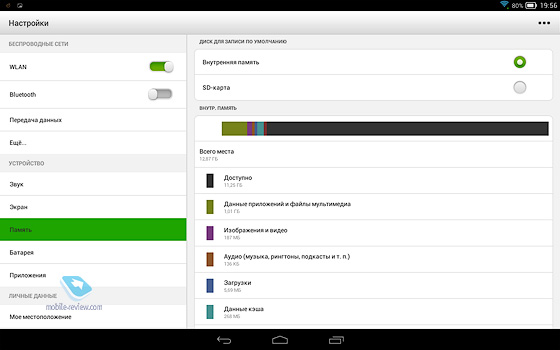 В планшете 16 ГБ встроенной памяти, из них пользователю доступно около 13 ГБ. Также можно использовать карту памяти.