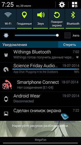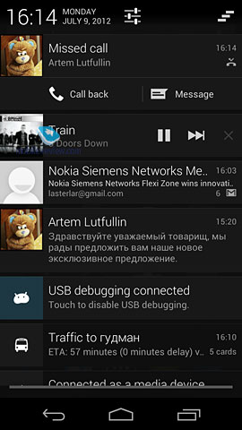 Потянув за верхнюю часть экрана вниз, вы попадаете не только в раздел с быстрой активацией той или иной функции, но и в систему уведомлений. Они представлены списком упоминаний, разделенных блоками других упоминаний в других приложениях. В качестве примера: если кто-то «ретвитнул» ваше сообщение в Twitter, то на экране появляется ник этого человека и краткий текст моего «месседжа» в строчку. Все достаточно просто и малофункционально. Естественно, хотелось бы иметь возможность отвечать на сообщения из «шторки» и получать больше информации из этих сообщений. Меня полностью устраивают уведомления в iOS: мало того, что настраиваются появления всплывающих уведомлений, так они еще остаются в строке состояния.
