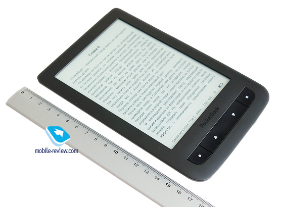 ДисплейВ PocketBook 626 установлен экран с диагональю 6'' и разрешением 1024x758 точек. Используется технология E-Ink Pearl, есть встроенная подсветка, верхний слой экрана – стекло. По таким характеристикам как углы обзора, контрастность, яркость и четкость картинки дисплей в PocketBook 626 очень хорош. Придраться буквально не к чему – есть запас яркости подсветки, углы обзора максимальные, четкость изображения очень высокая, «бумага» близка к белой. Подсветка равномерная, каких-то отдельных областей на поверхности экрана, освещенных хуже или лучше, нет.