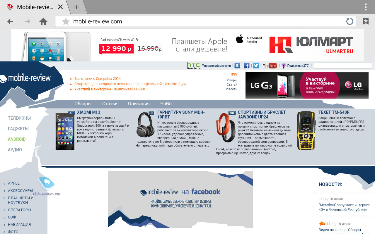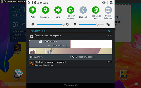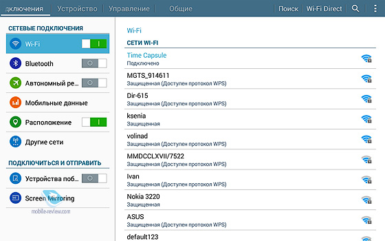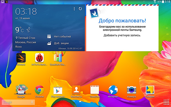 А теперь о грустном. На дворе 2014 год, а в Samsung по-прежнему используют HD-разрешение на десятидюймовых планшетах, и ладно бы Tab 4 10.1 стоил 7-8 тысяч. Но при ценнике в 15 тысяч рублей видеть HD-разрешение в этом планшете, мягко говоря, странно. Все конкуренты обладают куда лучшими дисплеями при той же цене, но к этому вопросу мы еще вернемся в соответствующем разделе. Хуже всего дисплей справляется с мелкими шрифтами, они выглядят мутными и размазанными, это вина низкого разрешения. Операционная системаПланшет работает под управлением Android 4.4.2 с установленной оболочкой TouchWiz поверх него. Эльдар Муртазин подготовил полноценный обзор этой версии TouchWiz, вы можете ознакомиться с ним по ссылке ниже, я же не буду в очередной раз описывать эту оболочку. Отдельно отмечу, что в отличие от линейки Pro, в Tab 4 10.1 нет фирменного Magazine UI. ПроизводительностьЗа производительность отвечает чипсет Qualcomm Snapdragon 400 MSM8226 с четырехъядерным процессором, работающим на частоте 1,2 ГГц, видеоускоритель Adreno 305 (есть поддержка OpenGL ES 3.0), объём оперативной памяти 1,5 ГБ, ёмкость внутреннего накопителя — 16 ГБ (пользователю доступно 11,92 ГБ), есть слот для карты памяти (поддерживаются карты объёмом до 64 ГБ). В сравнении с Tab 3 10.1 этот планшет работает более плавно, видимо, использование чипсетов Qualcomm сказывается на производительности. Мощностей чипсета хватает для плавного воспроизведения любого, даже очень «тяжелого» видео и всех современных игр. Что касается листания рабочих столов, то оно стало куда более плавным, но по-прежнему далеко от идеального. Автономная работаВ планшете установлена несъемная литий-ионная батарея ёмкостью 6800 мАч. В режиме чтения (яркость 10%, режим «в самолете» включен) планшет разрядился за 15 часов. В режиме видео заряда устройства хватило на 7 часов (максимальная яркость, режим «в самолете» включен). При повседневном использовании вы можете рассчитывать на 4-5 дней автономной работы, в зависимости от интенсивности использования. КамераВ планшете есть две камеры — основная 3 МП и фронтальная 1,3 МП. Основная камера тут явно для галочки, так как снимает она весьма посредственно, а вот фронтальная отлично подойдет для видеозвонков в Skype. Беспроводные интерфейсыМобильная сеть — версия с 3G-модулем работает в сотовых сетях 2G (GSM/GPRS/EDGE, 850/900/1800/1900 МГц) и 3G (900/2100 МГц). Помимо передачи данных, вы также можете и звонить с планшета. Wi-Fi (b/g/n) — в настройках можно включить «раздачу» мобильного интернета с помощью Wi-Fi, а также воспользоваться передачей файлов с помощью Wi-Fi Direct. Из приятных особенностей — поддержка двухдиапазонного Wi-Fi. Bluetooth 4.0 – поддерживаются все популярные профили, в том числе A2DP. GPS — холодный старт занял всего 6 секунд, это отличные показатели, впрочем, это неудивительно, ведь здесь используется чипсет Qualcomm. ИК-порт — для использования планшета в качестве пульта для техники, в устройстве уже предустановлена программа для работы с ИК-портом. ЗаключениеРекомендованная розничная цена планшета составляет 15 000 рублей за версию с Wi-Fi, а версия Wi-Fi+3G обойдется вам в 19 000 рублей. За эти деньги вы получаете тонкий и легкий планшет с хорошим временем автономной работы и поддержкой множества видеоформатов, но посредственным дисплеем, главным недостатком которого является низкое разрешение. КонкурентыЧестно говоря, планшет несильно изменился в сравнении с тем же Tab 3 10.